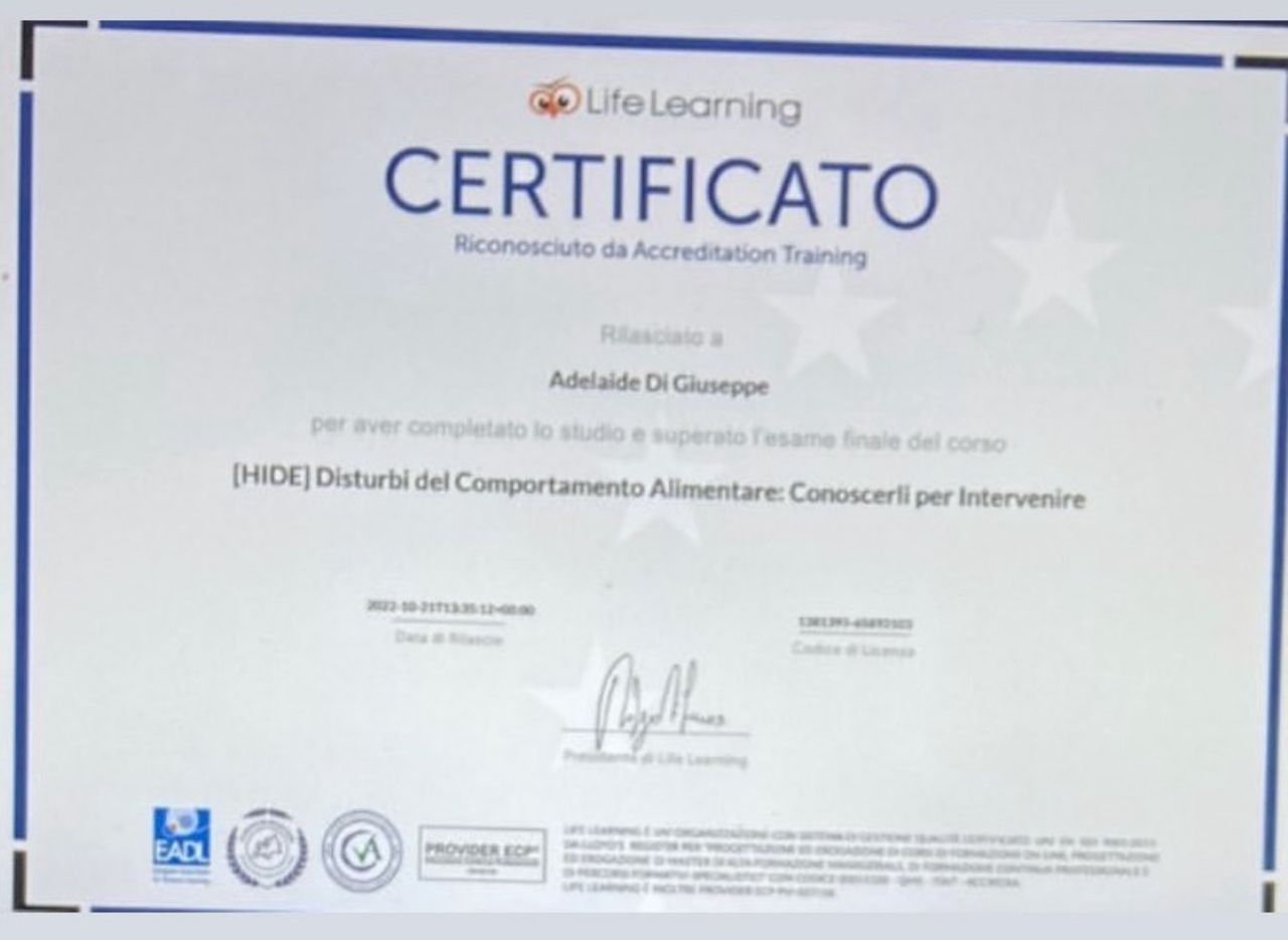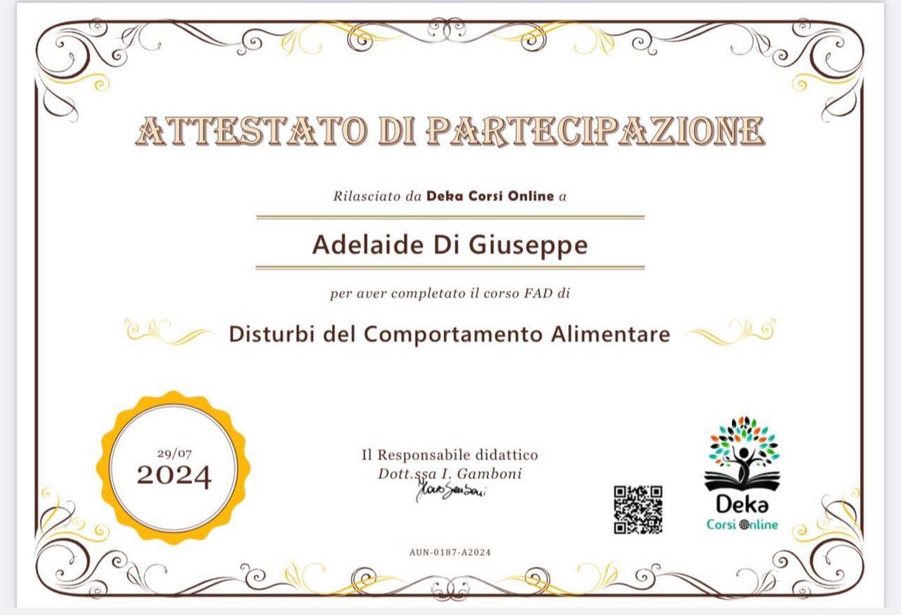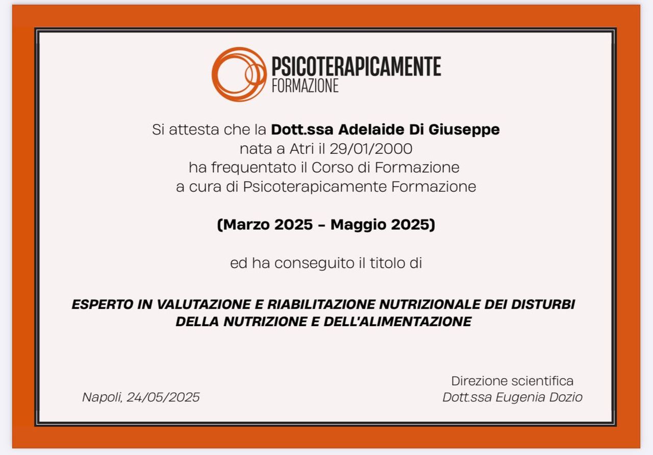 Ho iniziato il percorso con Adelaide a luglio e inizialmente non pensavo di farcela ne tanto meno di poter essere aiutata. Ma ad oggi, 26 settembre, posso finalmente dire di star guarendo. Con i suoi consigli, il suo supporto, la sua professionalità, la sua empatia e il suo voler realmente aiutare chi ha difronte ha sempre saputo sostenermi fino a farmi arrivare a piacermi. A luglio era un periodo di continue abbuffate e dí sensazione di disgusto nel guardarmi allo specchio ma con soli due mesi é riuscita a farmi cambiare idea sulla percezione del mio fisico e mi ha aiutata a migliorare il rapporto con il cibo. Le devo un grazie che a dir la verità é anche poco.. Lei ha sempre una parola, quella parola, che vuoi che ti venga detta in quel momento per stare bene. Non mi sono mai sentita giudicata ed é una cosa che apprezzo. Adelaide é speciale e anche molto brava nel suo lavoro