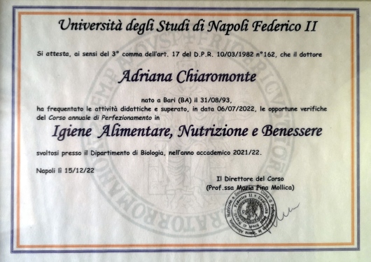 La mia passione per la scienza mi ha spinta a conseguire prima la laurea triennale in Scienze Biologiche presso l'Università degli studi di Bari Aldo Moro e poi a spostarmi a Napoli, dove ho concluso gli studi magistrali in Scienze Biologiche con indirizzo diagnostica molecolare presso l'Università degli studi di Napoli Federico II. Durante il periodo di tesi svolto presso il dipartimento di Medicina sperimentale del Policlinico Vanvitelli ho avuto modo di studiare in vitro le applicazioni dei probiotici e dei lattobacilli al fine di migliorare e prevenire disordini e patologie del sistema gastrointestinale e, in questo contesto ho scoperto il Microbiota, quanto questo vari da persona a persona e quanto possa influenzare le nostre vite. Da quel momento in poi tutti i miei studi sono stati orientati su questo tema: ho continuato a svolgere ricerca sperimentale conseguendo varie pubblicazioni scientifiche e infine ho intrapreso la Scuola di specializzazione clinica in Microbiologia e Virologia presso l'Università degli studi della Campania L. Vanvitelli, di cui sono fortemente appassionata. Per trovare un riscontro nella realtà rispetto a ciò che ogni giorno vedevo in laboratorio , ho conseguito un Corso di perfezionamento in Igiene alimentare, NUTRIZIONE e benessere presso l'Università degli studi di Napoli Federico II. Non mi sono fermata, continuo regolarmente ad aggiornarmi con corsi relativi a tematiche specifiche come le malattie metaboliche e ho svolto attività di tirocinio presso 4 studi nutrizionistici tra la Puglia e la Campania, dove i miei colleghi mi hanno aiutata nella crescita professionale e nel rapporto con il paziente. In ogni persona conosciuta ho ritrovato un frammento di me, di tutti noi: fame emotiva, stress, schiscette da portare a lavoro, patologie cliniche, patologie batteriche, stanchezza, gravidanza e allattamento, sport e allenamenti, DCA (disturbi del comportamento alimentare); ed è allora che ho compreso che in un mondo che corre e non ci lascia tempo: imparare ad ascoltare i propri bisogni e amarsi diventa un' esigenza. Vivere meglio e star bene nutrendo il proprio corpo in modo sano, gestire alimentazione ed emozioni per entrare di nuovo in armonia con sè stessi è un lavoro lento, un percorso lungo una vita, ma con le giuste accortezze, realizzabile.