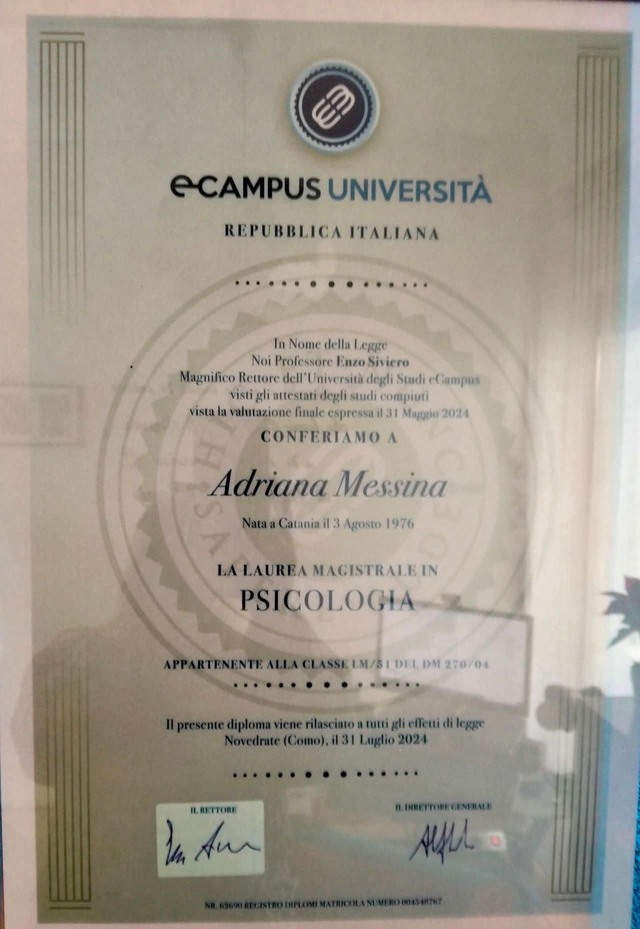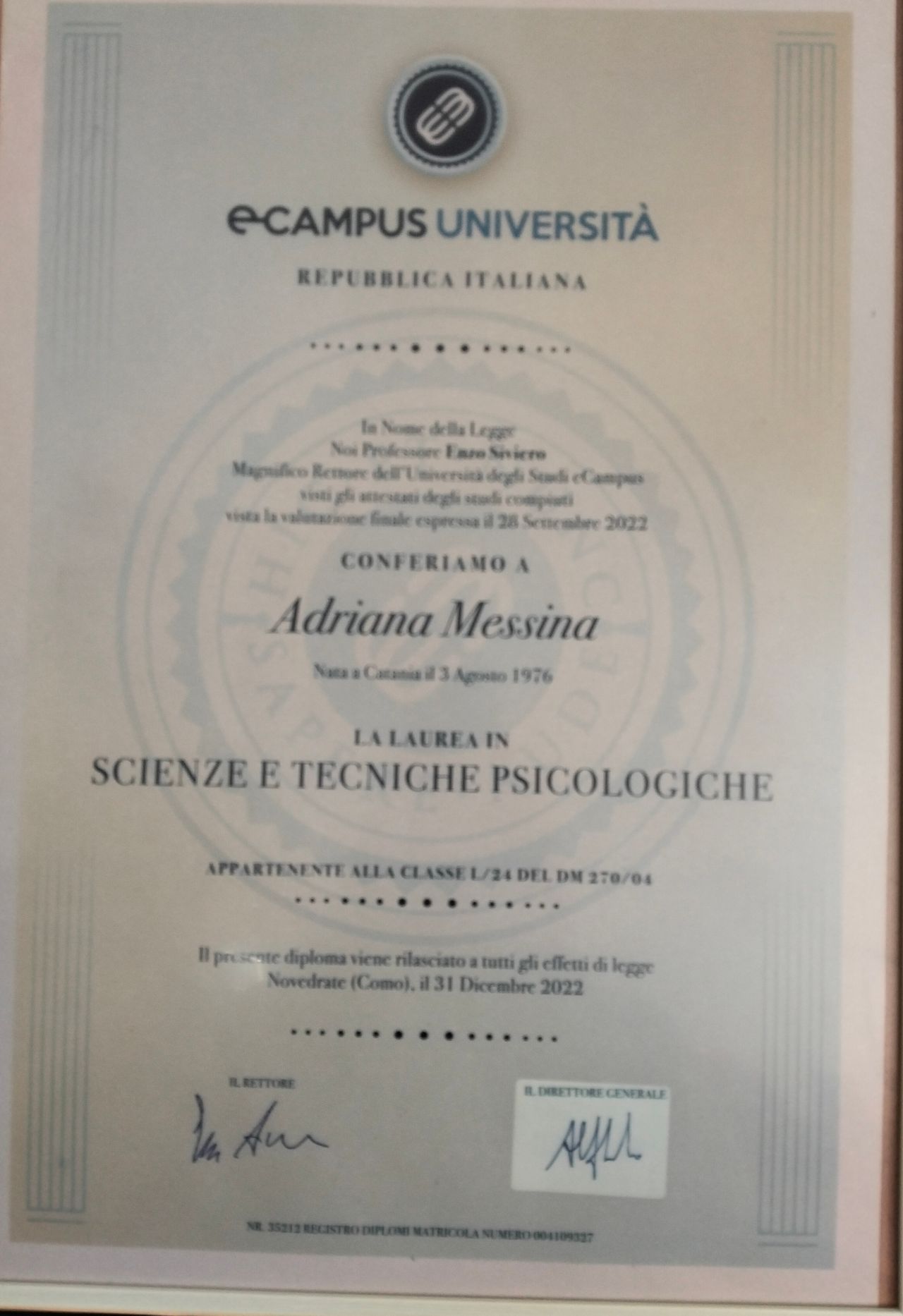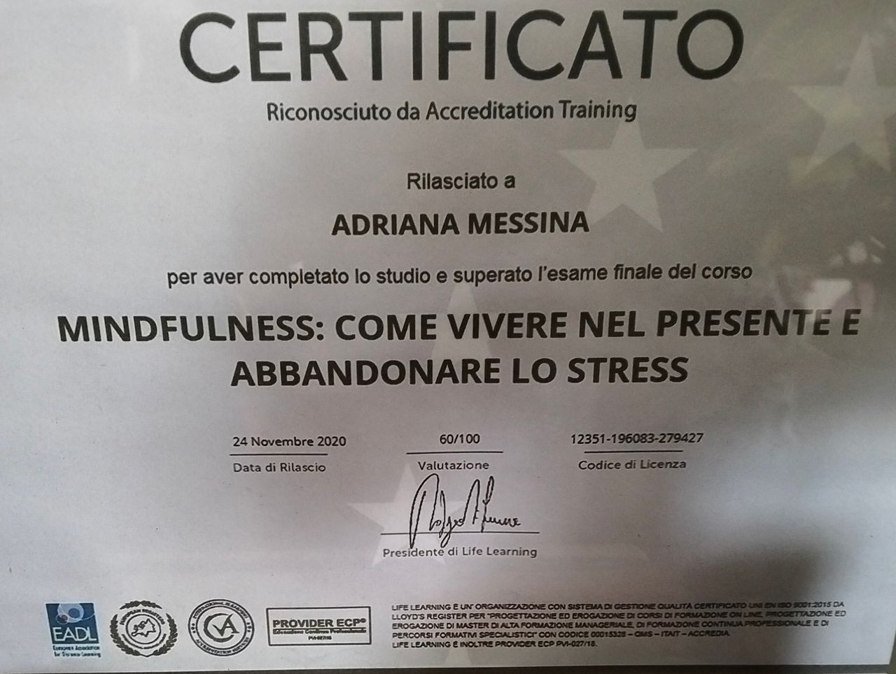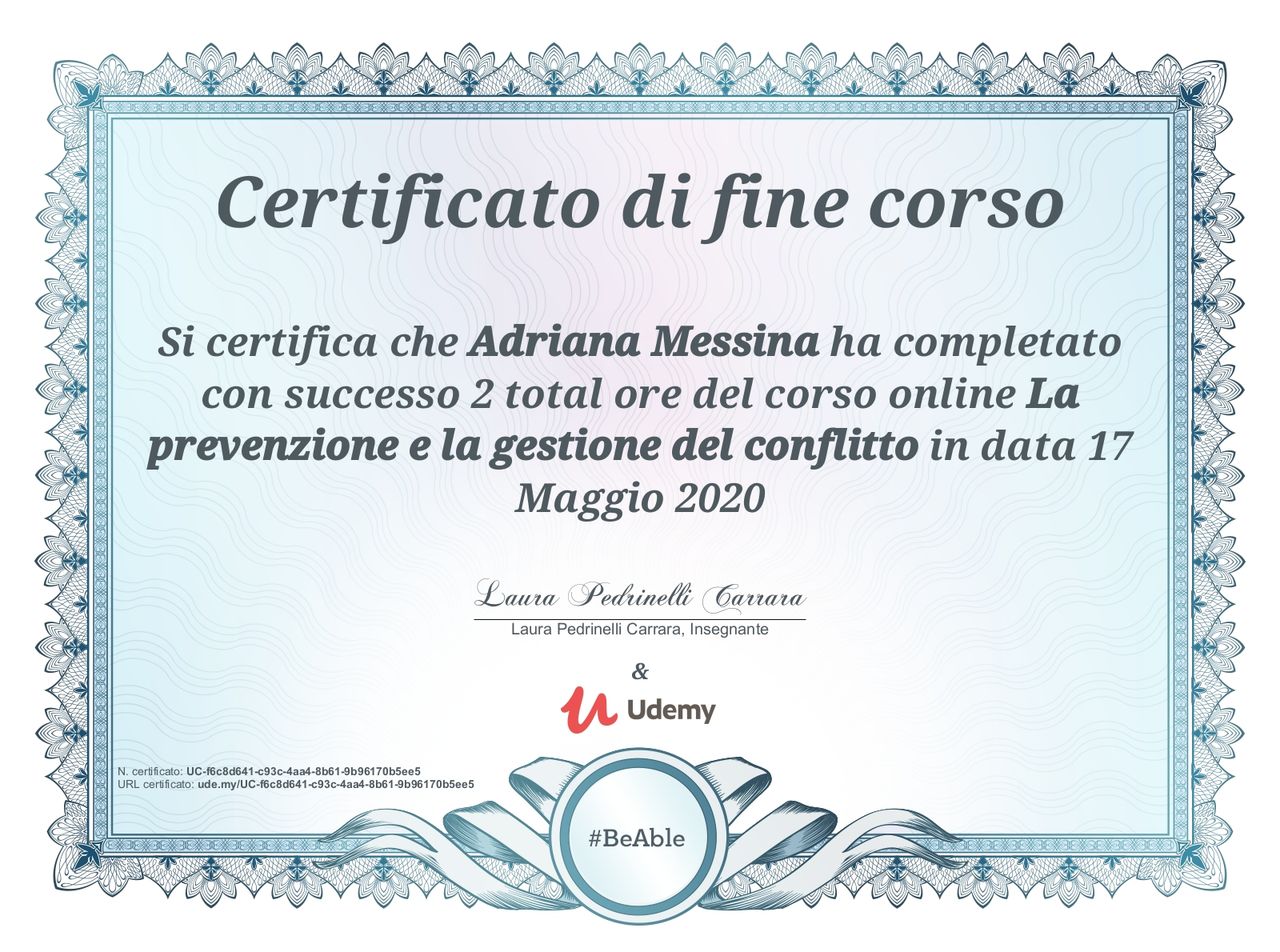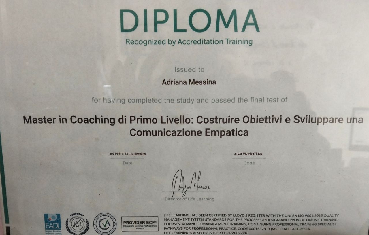 Ho conseguito un Master di 1° livello su "Costruire Obiettivi e Sviluppare Una Comunicazione Empatica" e un Master di 1° livello su "Mindfulness. Come vivere nel presente e abbandonare lo stress".