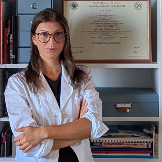 La Dottoressa Agnese Feresin è specialista in Genetica Medica con particolare attenzione alla diagnosi precoce e personalizzata in tutte le fasi dello sviluppo umano e in modo specifico nell'epoca prenatale. Ha consolidato la sua esperienza attraverso una formazione approfondita in Italia e all'estero, maturando competenze nella diagnosi di malattie genetiche sia rare che comuni, dal periodo prenatale fino all'età adulta. Attualmente la Dottoressa Feresin è impegnata nello studio e nell'applicazione di una nuove tecnologia per lo screening precoce di patologie genetiche presso Menarini Silicon Biosystems, è curatrice di ClinGen (NIH) e svolge inoltre attività clinica di consulenza genetica, offrendo supporto a coppie e singoli individui. Partecipa attivamente a corsi di formazione, di aggiornamento e congressi nazionali e internazionali. Ha collaborato alla stesura di articoli scientifici pubblicati su riviste specializzate nazionali e internazionali. È membro di importanti società scientifiche, tra cui la Società Italiana di Genetica Umana (SIGU), la Società Francese di Patologia Fetale e Placentare (Soffœt) e la Società Internazionale di Diagnosi Prenatale (ISPD).