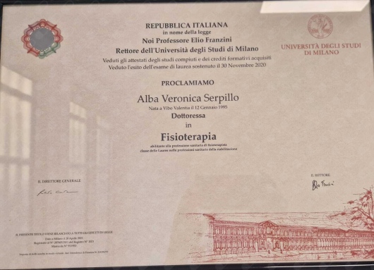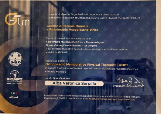 Mossa dalla passione per quest’ambito, nel 2021 mi sono iscritta al Master Universitario di I livello in Fisioterapia Muscoloscheletrica e Reumatologica, grazie al quale ho Conseguito il titolo di Orthopeadic Manipulative Physical Therapist (OMPT). Questo mi ha resa specializzata nella gestione delle problematiche neuro-muscolo-scheletriche di vario tipo, mediante un ragionamento clinico fondato sulle più recenti evidenze presenti in letteratura scientifica e una pratica basata su un’accurata Valutazione Iniziale e la redazione di un programma terapeutico strutturato su Educazione del paziente, Esercizio Terapeutico e Tecniche di Terapia Manuale.