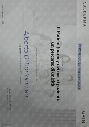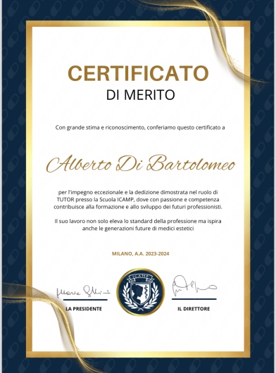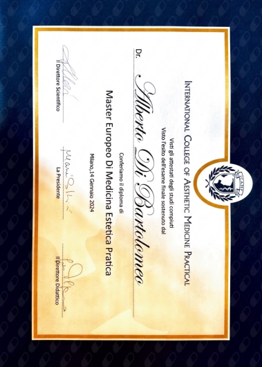 Sono il Dott Di Bartolomeo Alberto, ho conseguito la laurea in Medicina e chirurgia presso l’Università degli studi del Molise e ho proseguito i miei studi con un Master quadriennale Presso l'International College of Aesthetic Medicine Practical (ICAMP) con il massimo dei voti, dove attualmente collaboro come tutor.