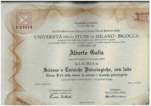 • Laurea in Scienze e Tecniche Psicologiche (110 e lode) presso l'Università degli Studi di Milano-Bicocca, con una tesi empirica sulla modulazione di variabili psicobiologiche mediante tDCS cerebellare (Relatore Prof. Angelo Maravita).