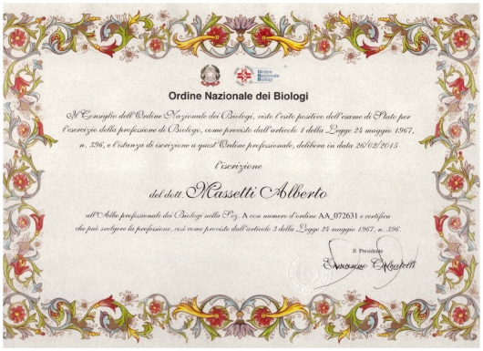 Sono un biologo nutrizionista. 2010 Laurea Triennale in biologia presso l’Università degli studi Bicocca di Milano con indirizzo fisiopatologia umana e tirocinio svolto presso lo studio del Dr Maurizio Bruschi, docente di chimica, nel progetto di studio sulla proteina p53 e il suo funzionamento come oncosoppressore. 2014 Laurea Magistrale in Biologia applicata alle Scienze della Nutrizione in seguito a tirocinio curricolare svolto presso la Fondazione I.R.C.C.S. “Istituto Nazionale dei Tumori” e nei laboratori dell’Università degli studi di Urbino, nell’ambito del progetto di studio “DIANA 5″ del Dr Franco Berrino che si occupa della prevenzione del tumore al seno e delle sue recidive attraverso la correzione dello stile di vita e dell’alimentazione; propedeutico alla tesi dal titolo: “Ruolo dell’IGF-1 nell’insorgenza di recidive in donne malate di tumore alla mammella”, relatrice: Dott.ssa Anna Villarini. Collaboro con il Centro Studi di Biologia e Biofisica della Nutrizione a Bergamo del Dr. Paolo Paganelli, presso cui ho seguito un periodo di tirocinio post-laurea. Esame di stato e abilitazione; in seguito iscrizione all’Ordine Nazionale dei Biologi Matricola AA_072631. Esperto in nutrizione sportiva (scuola SANIS)