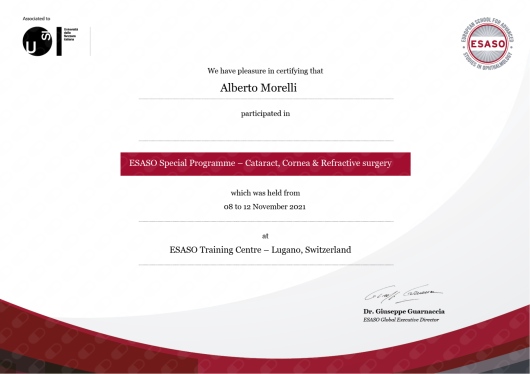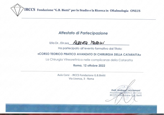 Nel suo percorso formativo si è specializzato in interventi di cataratta acquisendo competenze specifiche nella gestione dei casi complessi (scarsa dilatazione pupillare, cataratta avanzata, cataratta pseudoesfoliativa) e nell'impianto di lenti premium (correzione dell'astigmatismo, lenti ad aumentata visione intermedia e multifocali).