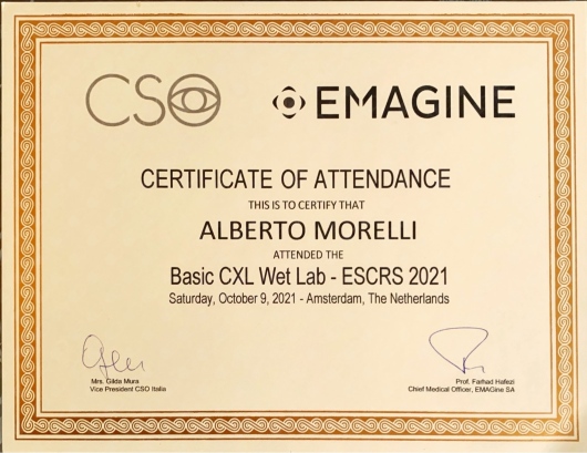 Si è perfezionato nella diagnosi e cura di patologie corneali acquisendo competenze specifiche nello studio e nella gestione della patologia del cheratocono, effettuando in prima persona interventi di crosslinking corneale. Ha eseguito inoltre un periodo di perfezionamento sulla gestione medica e chirurgica del glaucoma presso l'Ospedale di Cisanello a Pisa.