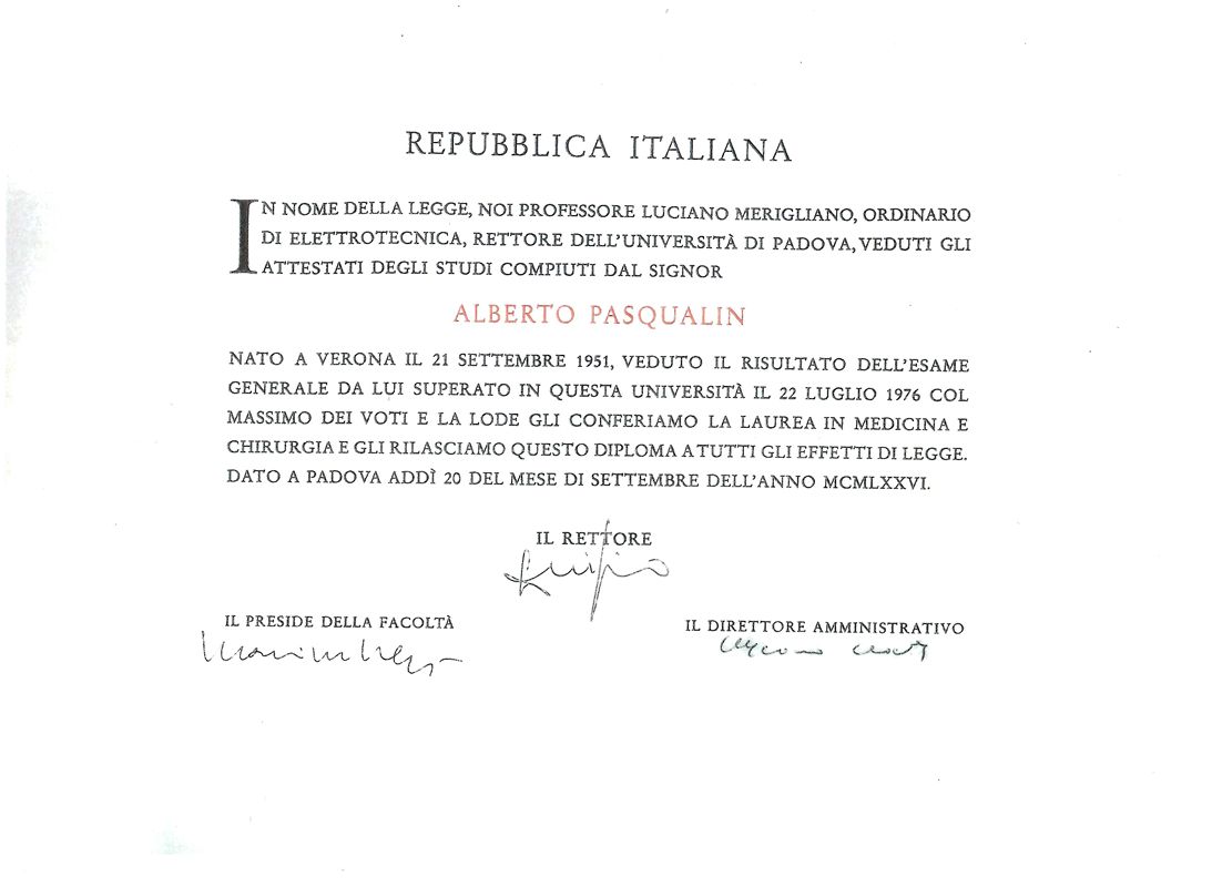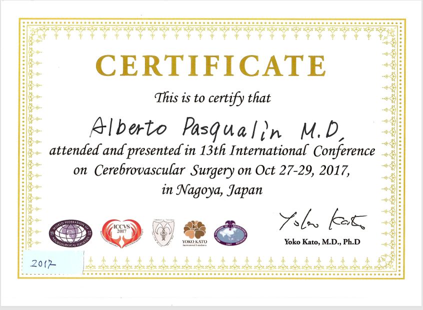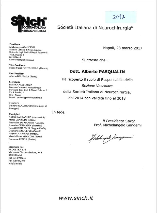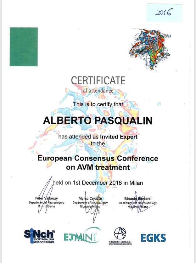 Il dottor Alberto Pasqualin è un neurochirurgo di grande esperienza sia nel campo cranico che nel campo vertebrale, con particolare interesse nella patologia vascolare (aneurismi, malformazioni artero-venose e cavernomi); in questa patologia è considerato un esperto a livello internazionale. Ha un particolare interesse anche per il trattamento chirurgico dei meningiomi e dei tumori gliali (astrocitomi e glioblastomi). Lavora a Verona e Brescia. Per maggiori informazioni, si prega di consultare il sito www.albertopasqualin.it