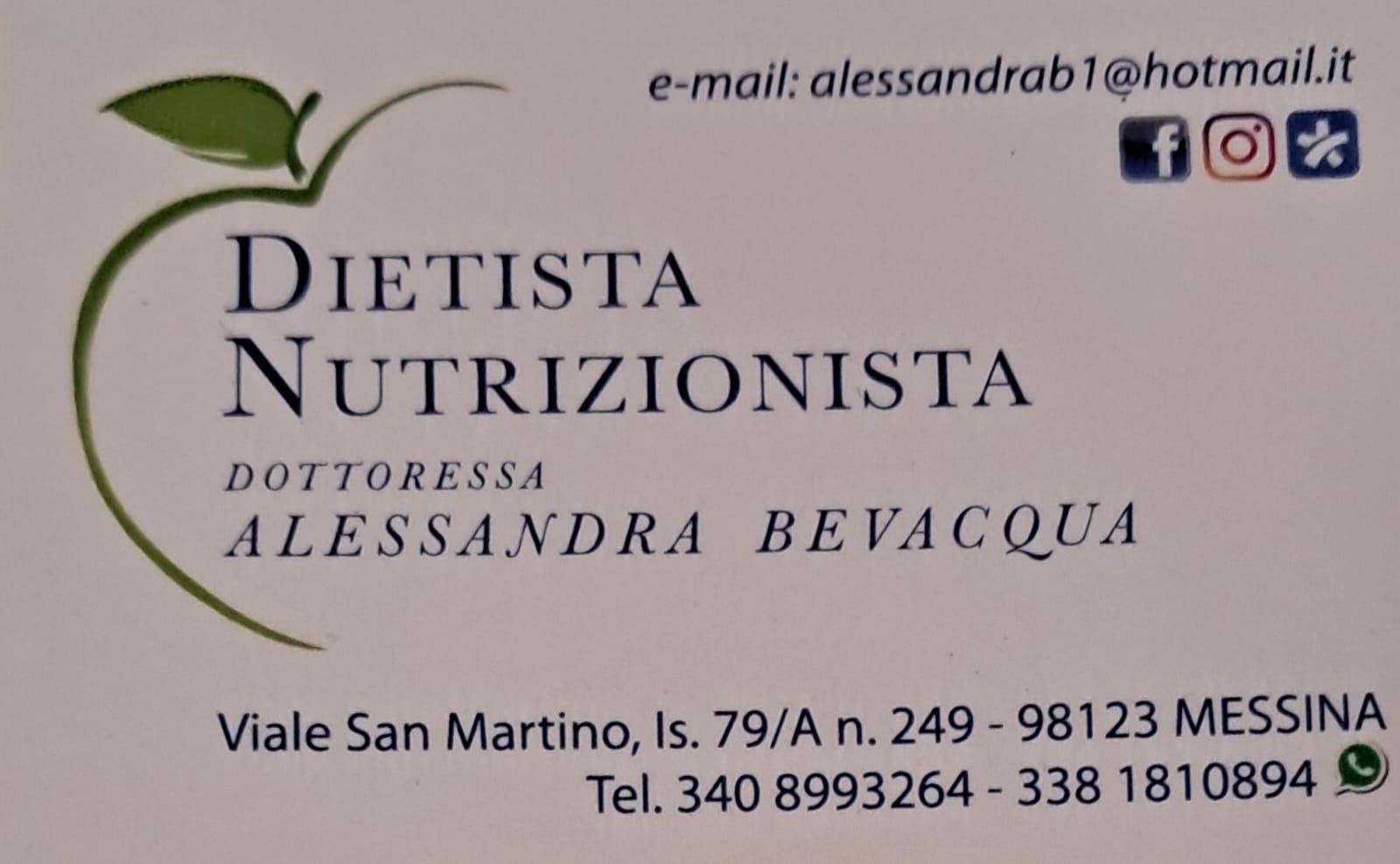 Sono la dott.ssa Alessandra Bevacqua dietista, con i miei piani nutrizionali do' la possibilità ai miei pazienti di ottenere ottimi risultati in poco tempo e senza dover fare troppi sacrifici. La mia esperienza ventennale e la mia disponibilità sono al servizio dei pazienti che si affidano alle mie cure e intraprendono un percorso di cambiamento fisico e psichico serenamente fino al raggiungimento e al mantenimento dei loro obiettivi.