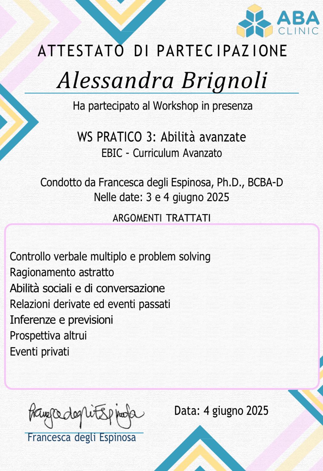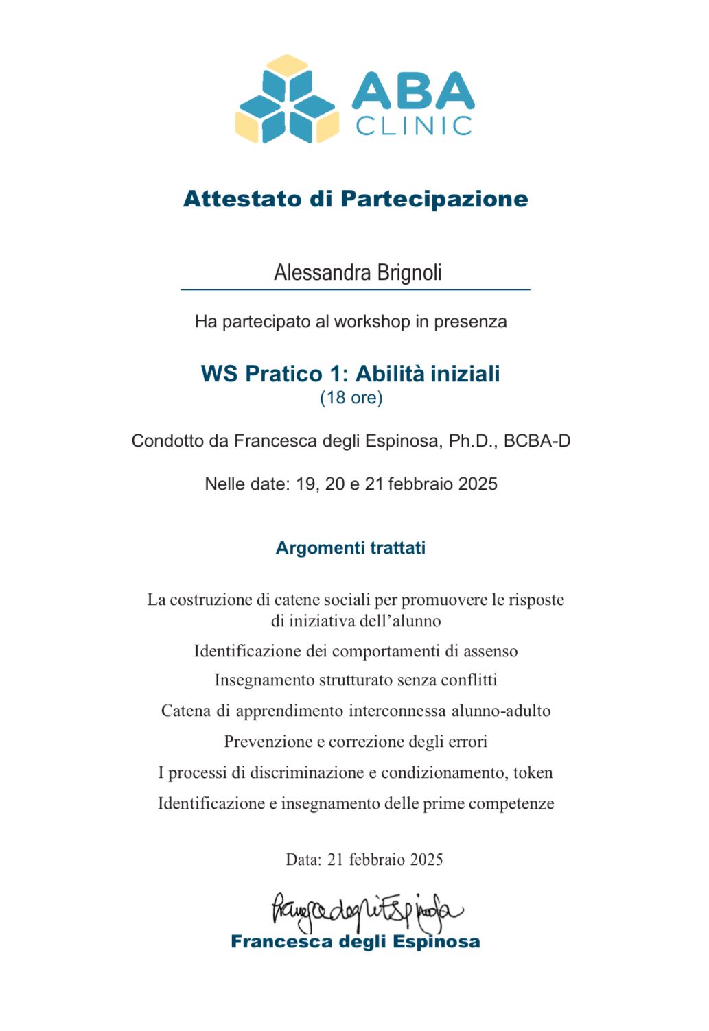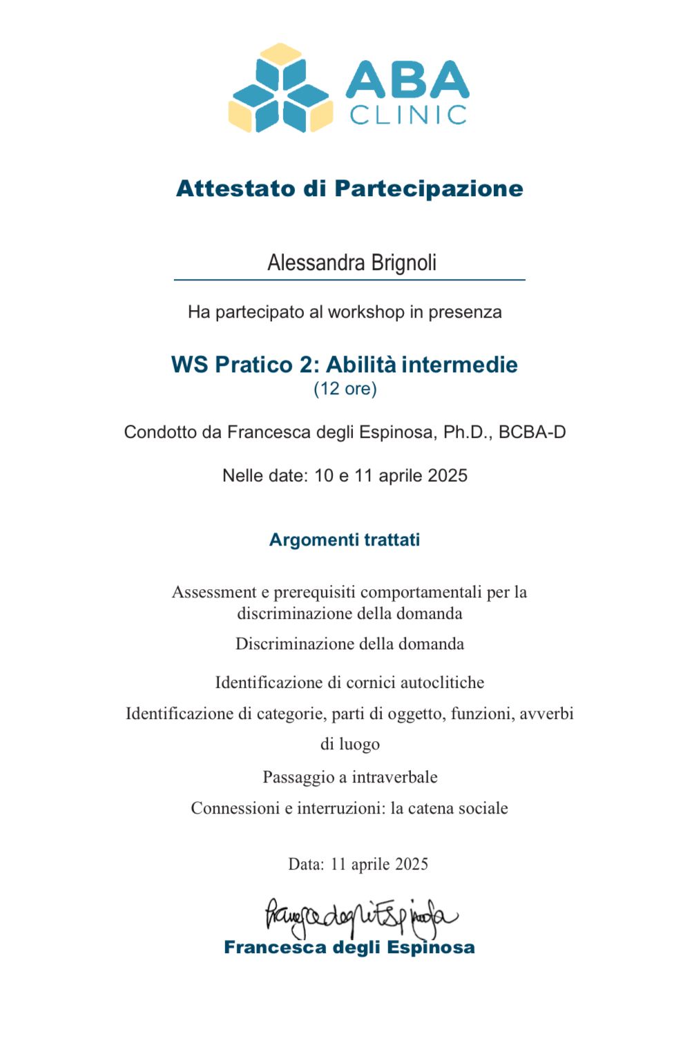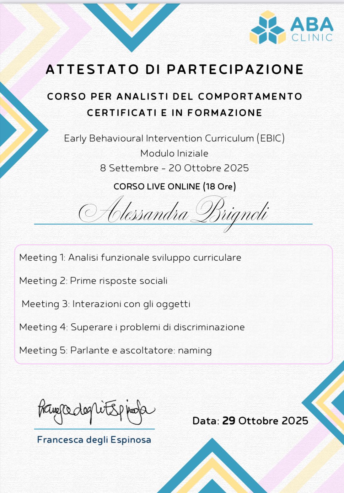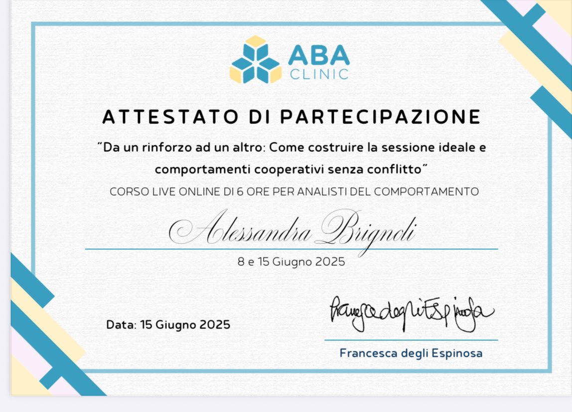 Ora la qualifica di Analista del Comportamento in formazione , mi permette di creare una programmazione personalizzata e individualizzata per ogni bambino o famiglia in base alle necessità e ai punti di forza/ debolezza del bambino/ della famiglia.