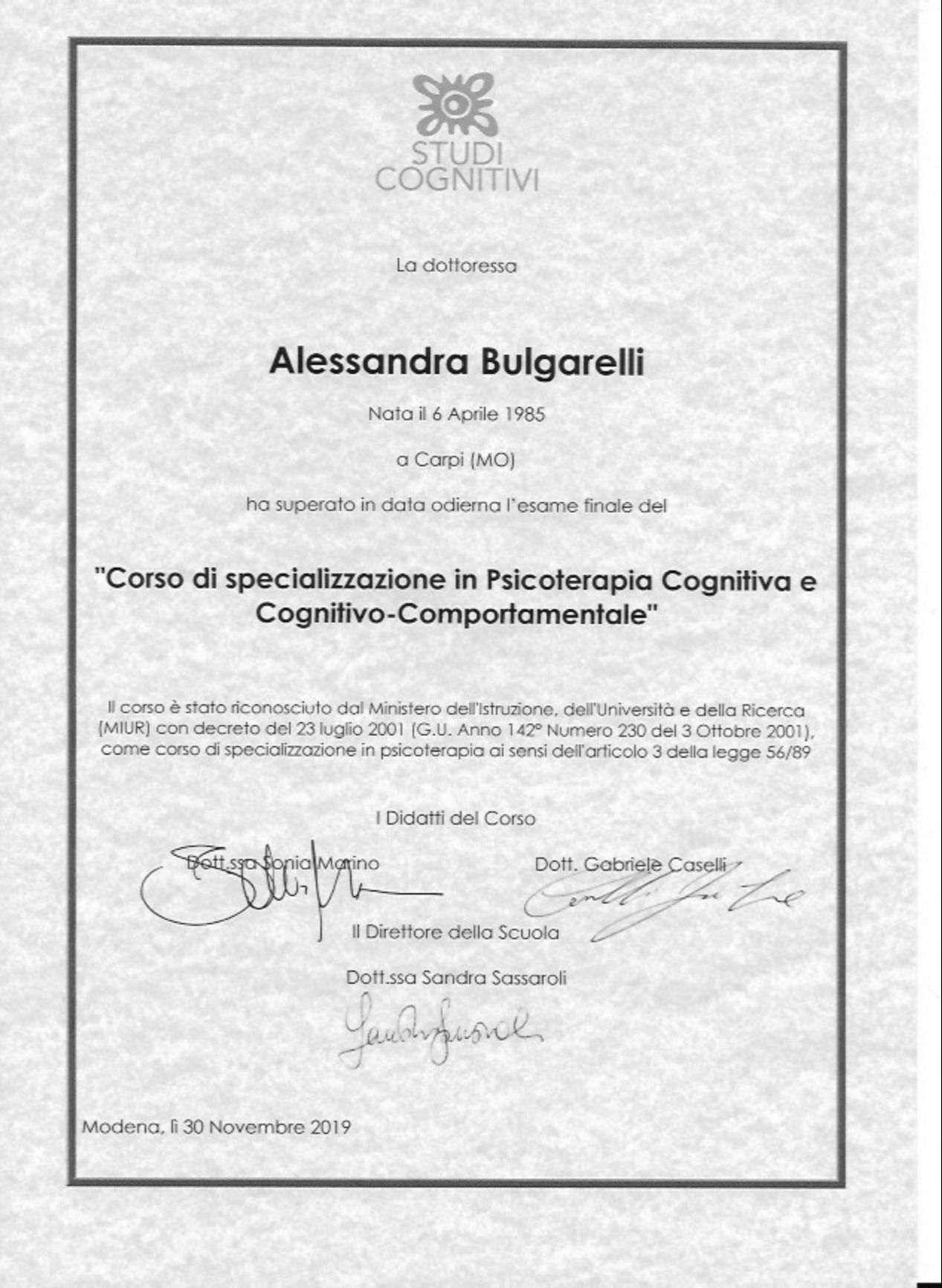 La Dottoressa Bulgarelli è sempre stata puntuale, professionale e competente. Grazie al suo ascolto e ai suoi feedback dettagliati ho potuto migliorare moltissimo la mia situazione, riuscendo a gestire e comprendere meglio il mio umore e la mia identità personale. Il percorso affrontato con la Dottoressa è stato veramente importante per la mia salute e crescita.