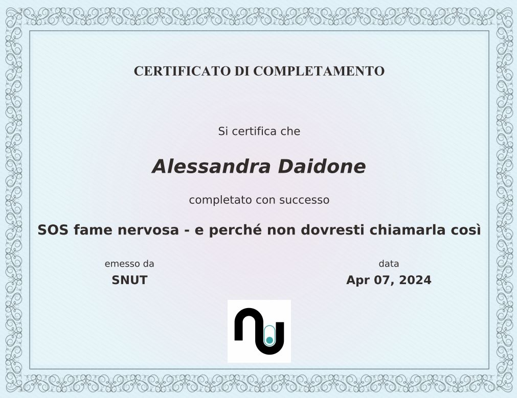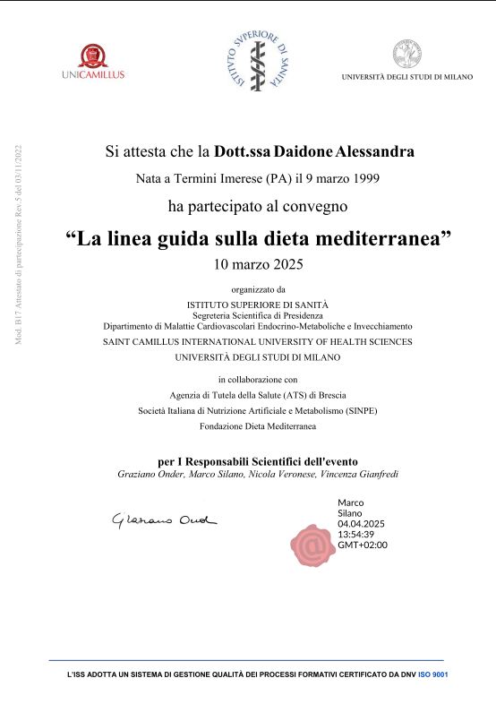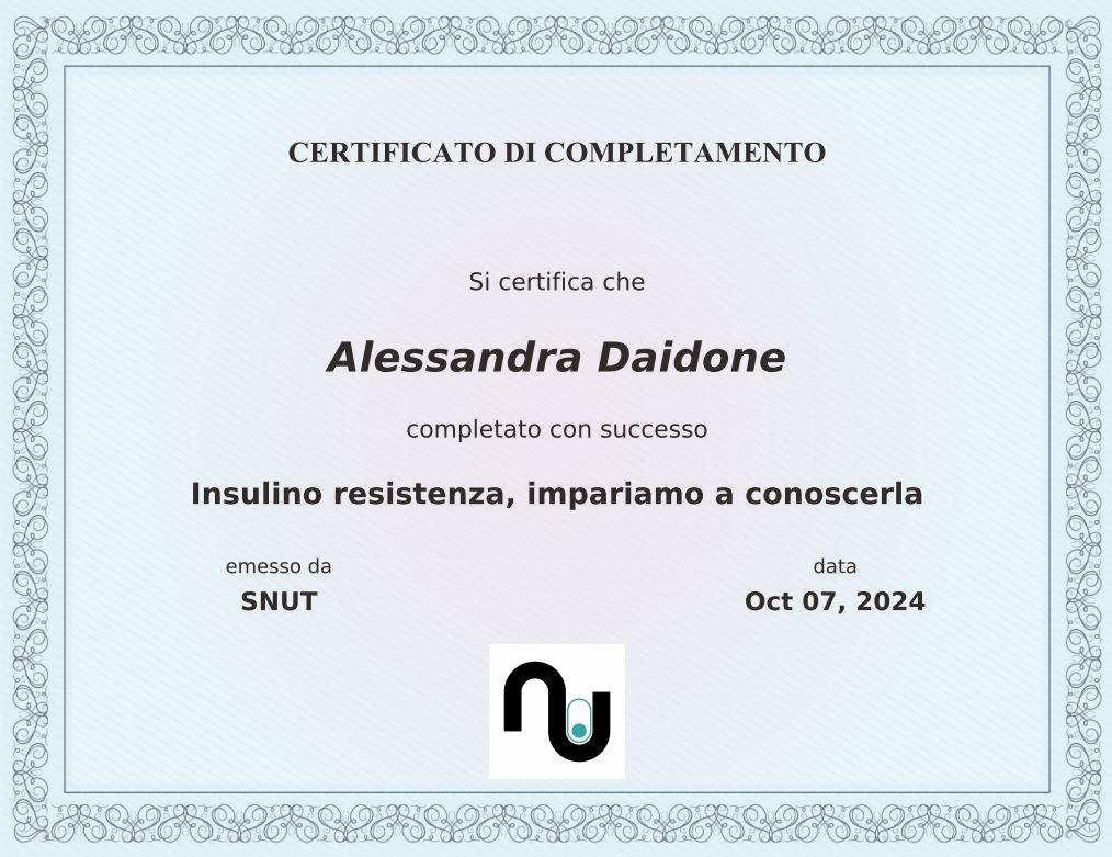 Nel frattempo ho conseguito svariati corsi di formazione specifica, seminari e svolto affiancamento volontario presso UOSD DIABETOLOGIA col l'azienda ospedaliera San Camillo Forlanini di Roma per la gestione dietetica-nutrizionale dei pazienti ambulatoriali;