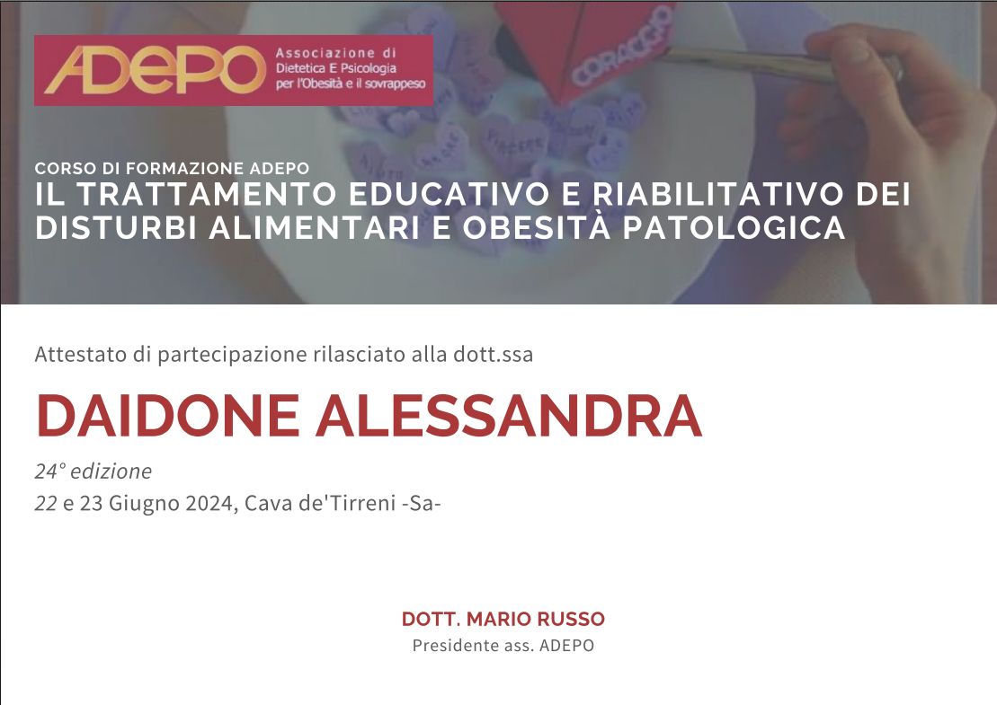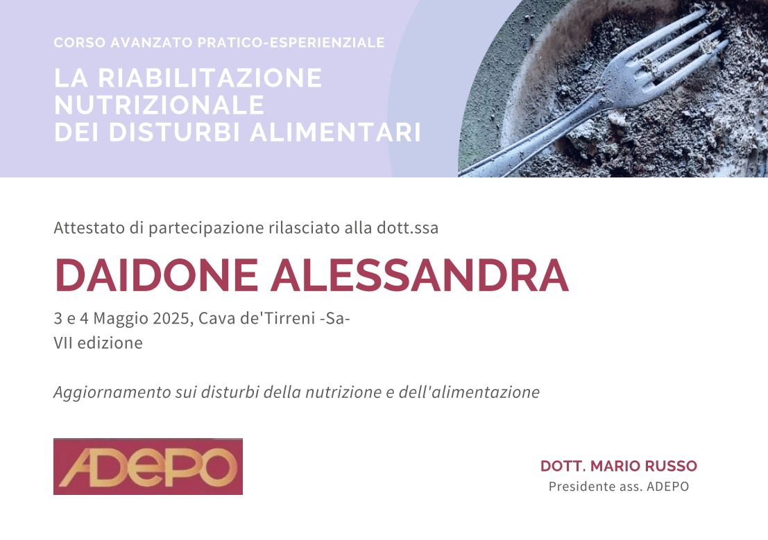 Corsi ADEPO base e avanzato (Associazione di dietetica e psicologia per l'obesità e il sovrappeso) per la riabilitazione nutrizionale nei disturbi alimentari.