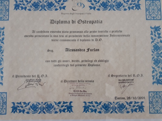 2001 Diploma di Osteopatia conseguito presso la scuola di Osteopatia e terapie manuali "Siotema" di Torino.