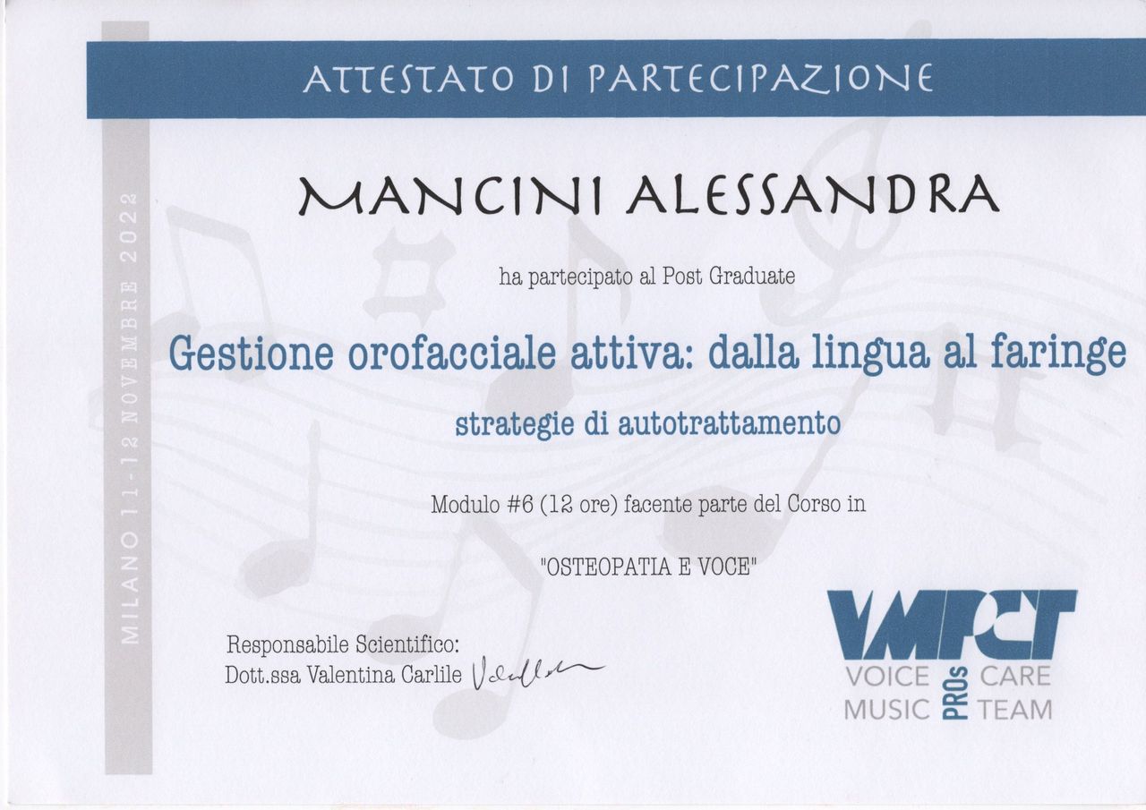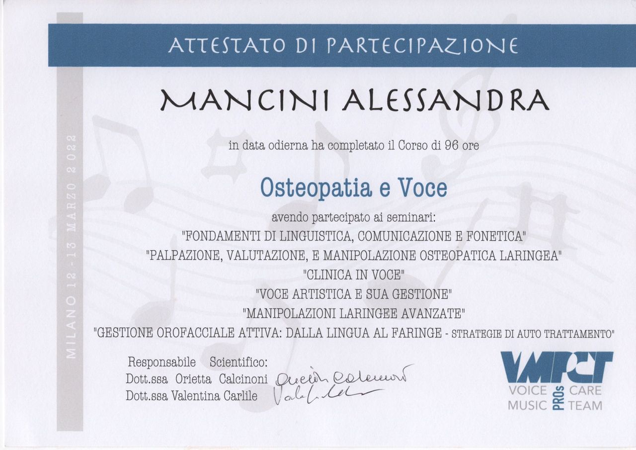 Tuttavia, ciò che mi distingue è la mia specializzazione nell'osteopatia in ambito foniatrico. Ho sviluppato competenze specifiche nel trattamento dei disturbi della voce e del canto, che mi permettono di lavorare in modo efficace con cantanti, attori, insegnanti e tutte le persone che utilizzano la voce come strumento di lavoro, collaborando strettamente con foniatri, logopedisti e altri professionisti del settore per garantire un trattamento completo e integrato.