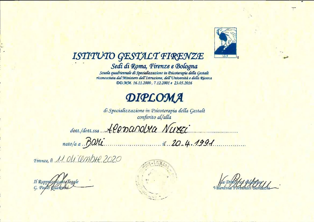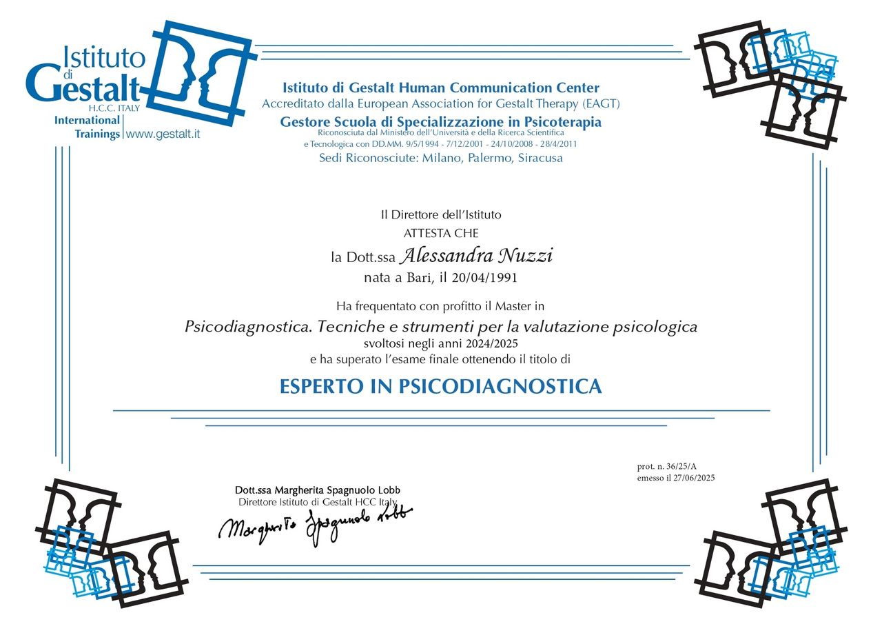 Sono Alessandra Nuzzi, psicologa e psicoterapeuta ad approccio gestaltico.