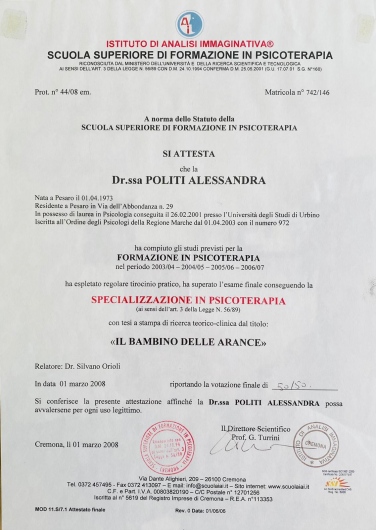 Buongiorno. Sono molto contenta di aver conosciuto Alessandra. Lei mi aiuta davvero ad acquisire fiducia in me stessa e ad aumentare la mia autostima. Grazie a lei sto imparando a comunicare in meglio con i miei figli, ho potuto stabilore un dialogo costruttivo con il mio ex marito. Vorrei inoltre ringraziarla perchè tiene conto della mia nazionalità, rispettando le mie radici e la mentalità in quale sono stata cresciuta. Dopotutto, questi sono parametri molto importanti che devono essere presi in considerazione da uno specialista.