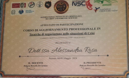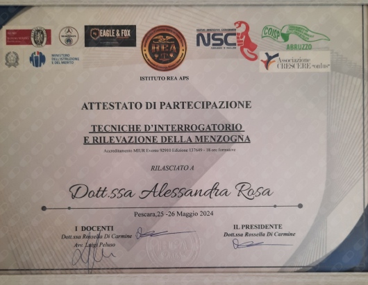 Master in Scienze forensi, Criminologia, Analisi Investigativa e Tecniche di Interrogatorio; master in Psicologia Clinica, Psicopatologia e Psicologia dei Gruppi.