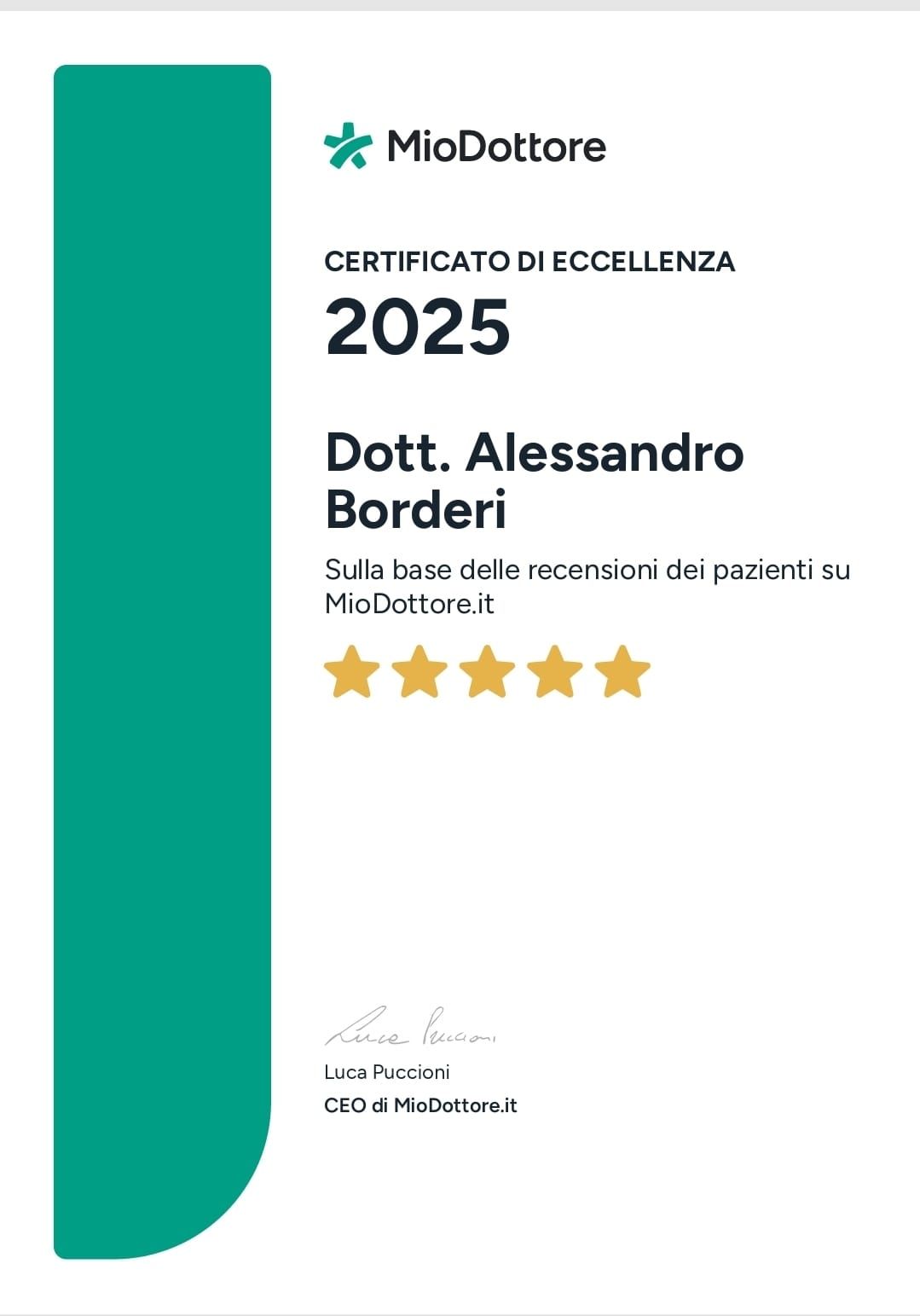 Ho conosciuto il dott. Borderi tramite il mio medico curante. Durante la prima visita la spiegazione del mio problema da parte del dottore è stata molto accurata e dettagliata. In modo diretto e con molta empatia il dottore mi ha spieg L"ato tutta la situazione e il da farsi. Altrettanto bravo e professionale stato durante il mio intervento, parliamo di una severa discopatia L2-L3 con ernia discale e spondilolistesi instabile L5-S1 associata ad ernia discale. Una brava persona e un ottimo neurochirurgo. Consigliatissimo