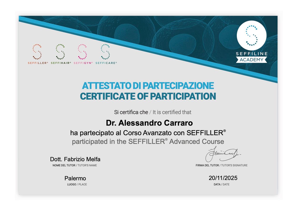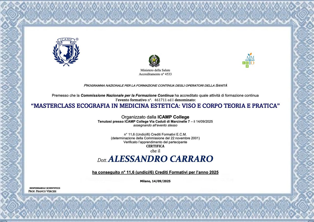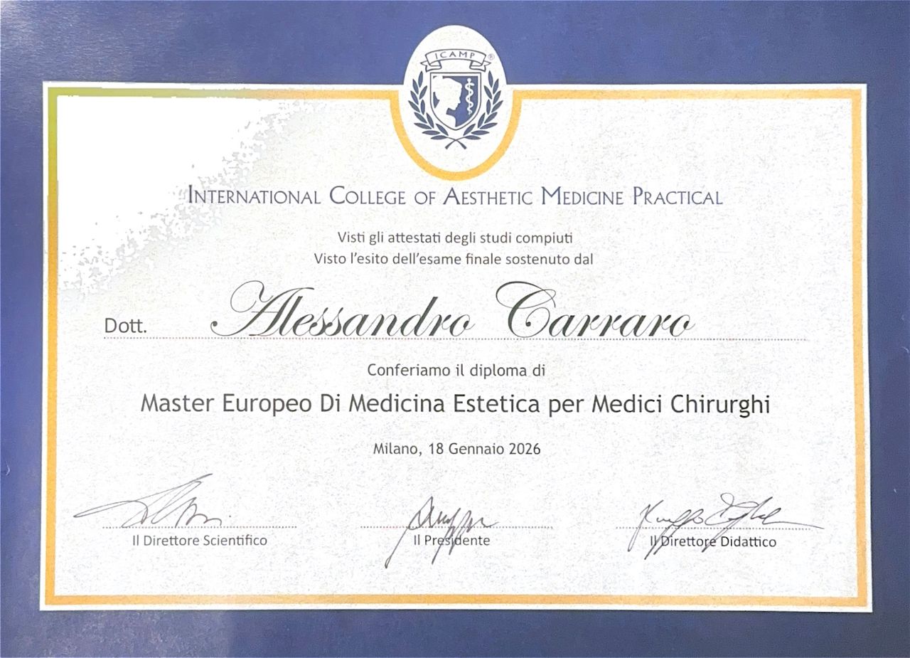 Mi chiamo Alessandro, dopo la Laurea In Medicina e Chirurgia ho frequentato per due anni la scuola di specializzazione in Chirurgia Generale, indirizzandomi successivamente verso la Medicina Estetica. Ho scelto quindi di formarmi frequentando il master presso la scuola ICAMP (International College of Aesthetic Medicine) a Milano. Al momento dedico il mio tempo, il mio studio e il mio lavoro esclusivamente a quest’ambito, per cercare di fornire ai pazienti i migliori trattamenti disponibili. Vedo la Medicina Estetica come un percorso che può accompagnare chi lo desidera in ogni fase della vita; come medico, miro ad estendere il concetto di salute “…non solo all’assenza di malattia o infermità, ma al completo benessere fisico, mentale e sociale”(Definizione di salute, OMS). Base scientifica, umanità e professionalità sono gli strumenti che ho a disposizione per raggiungere questo fine mettendo il paziente al centro.