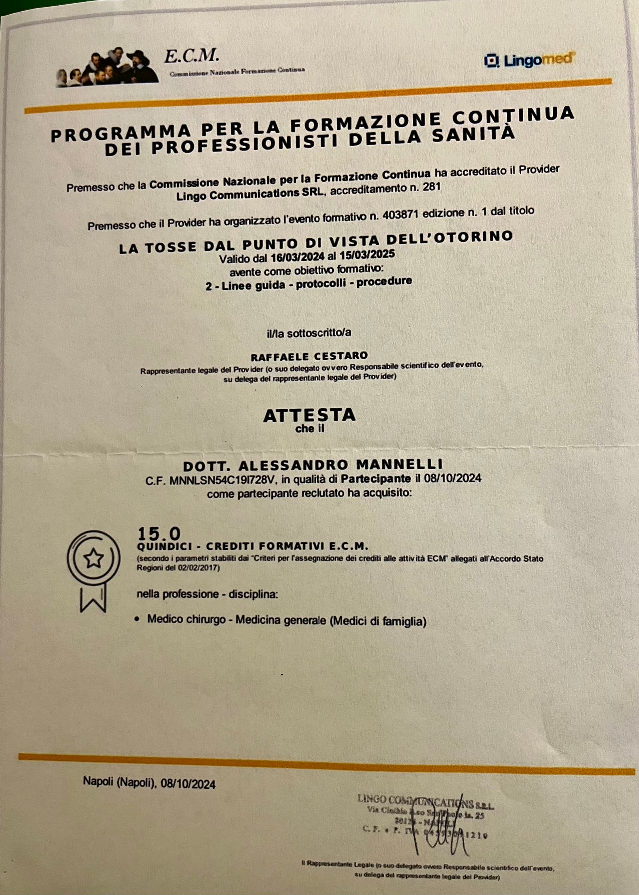 L'Otorino Dr.Alessandro Mannelli . Lavora a Signa (Fi). Ha ottenuto l'autorizzazione a svolgere la professione medica in Medicina e Chirurgia nel 1979 a Firenze. E' riuscito a conseguire una specializzazione in Odontostomatologia nel 1991 presso l'Università degli Studi di Siena, in Audiologia nel 1985 presso l'Università degli Studi di Firenze, in Otorinolaringoiatria e Patologia Cervico Facciale nel 1982 presso l'Università degli Studi di Firenze. Ha studiato Medicina e Chirurgia e laureato nel 1978 presso l'Università degli Studi di Firenze