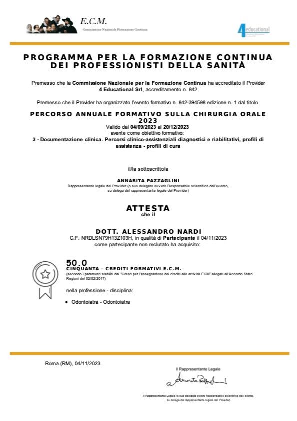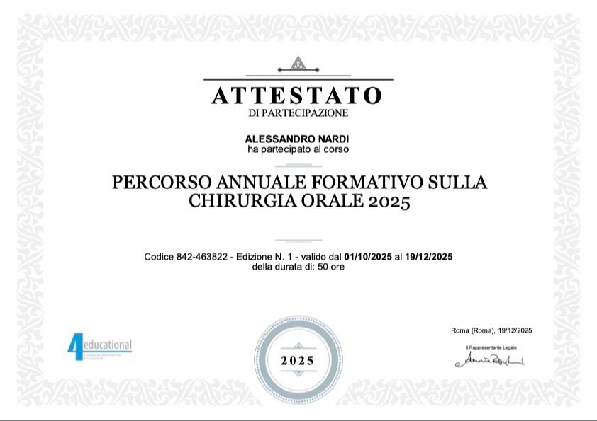 Dal 2019 ad oggi, frequento con assiduità lo studio del Prof. Roberto Pistilli, che considero un vero Maestro della Chirurgia Orale. Questo impegno continuo è per far sì che le mie tecniche siano sempre all'altezza dei più alti standard internazionali.