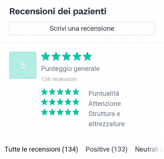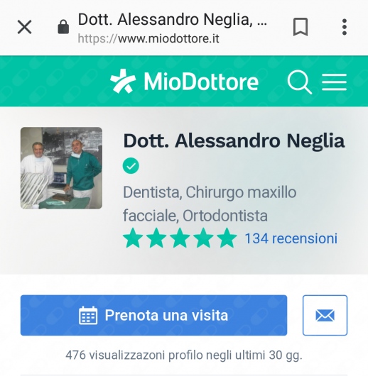 Dopo aver avuto una pessima esperienza in un famoso e costoso studio dentistico di Milano ( mi hanno rotto il dente del giudizio dopo 2 ore di intervento con dolori e stress inenarrabili senza riuscire a toglierlo, ) mi rivolgo al Dr Neglia dopo una attenta scelta sul web . Ebbene non solo è riuscito a togliermi senza dolore la radice rotta, ma mi ha estratto in pochi SECONDI un altro dente che avrei dovuto togliere al doppio del prezzo nello studio da cui sono scappata! Ho trovato delle assistenti capaci e sorridenti, un ambiente pulito e moderno, e dei prezzi onestissimi anche per altri trattamenti che ho eseguito ( consiglio lo sbiancamento con le mascherine proposte dal dottore) Ringrazio il sito Miodottore per avermi dato modo di trovare questo studio e queste persone e aggiungo questa recensione a tutte quelle che ho letto per aiutare chi è alla ricerca di un dentista a Milano. Il Dr Neglia è il top