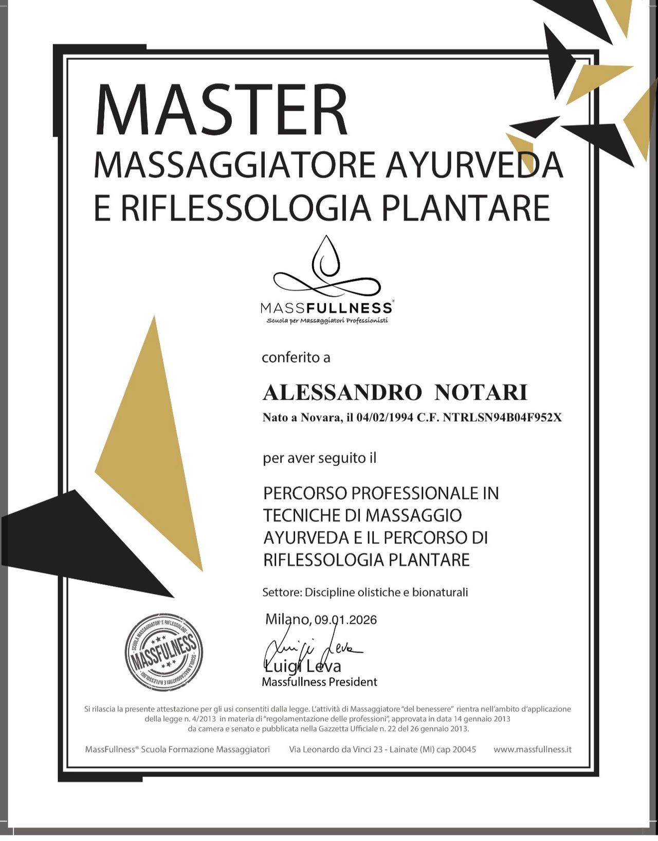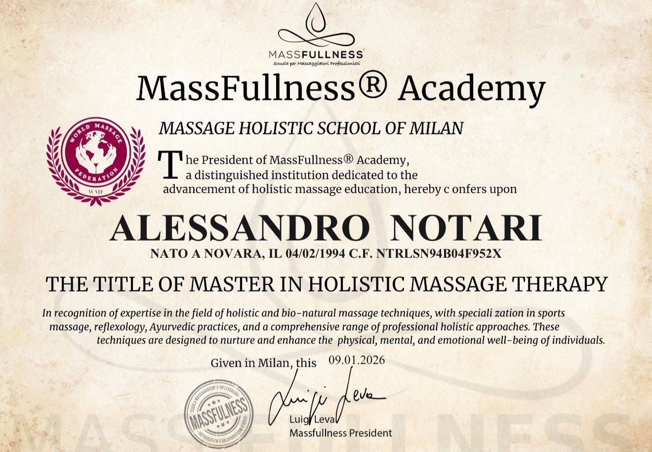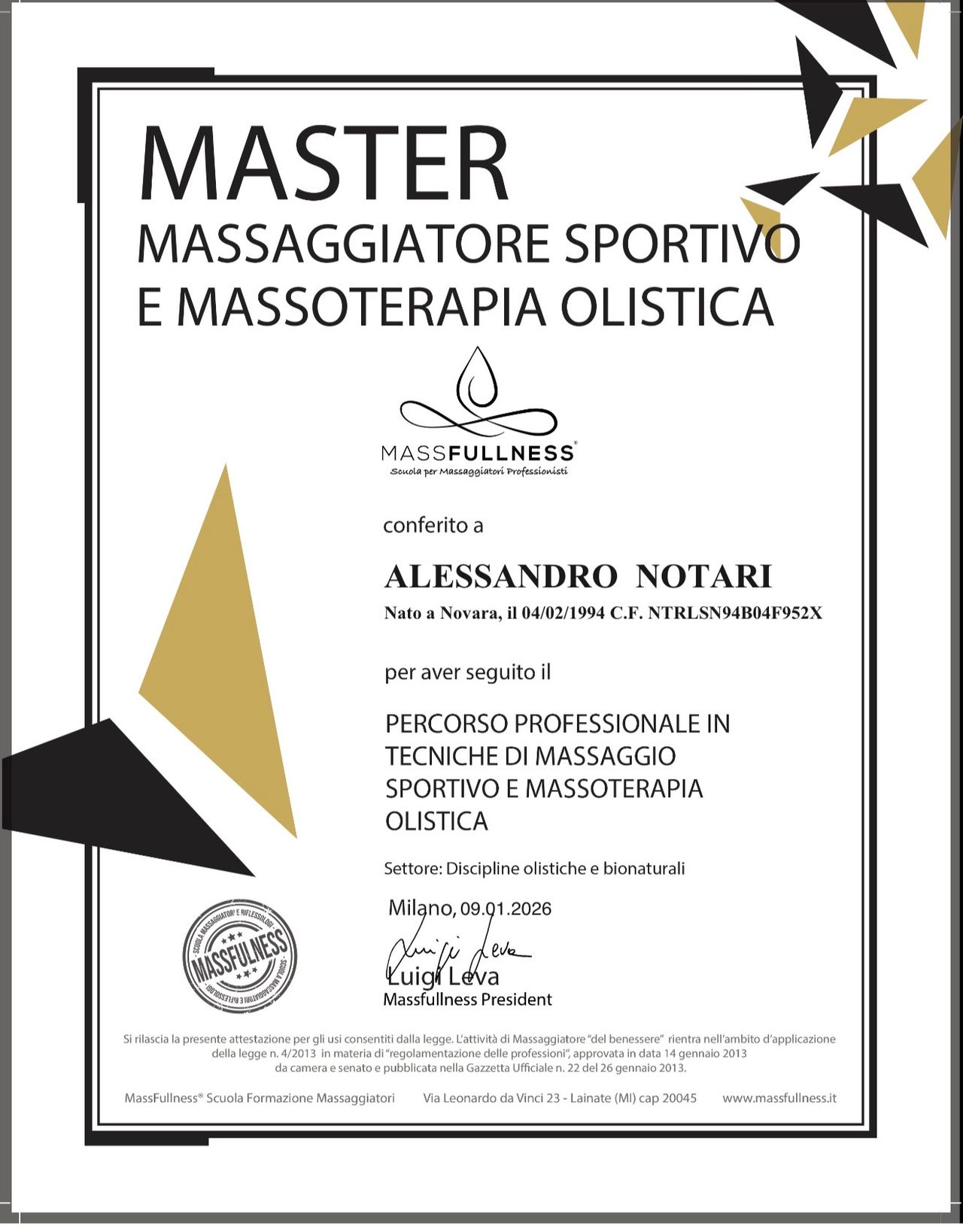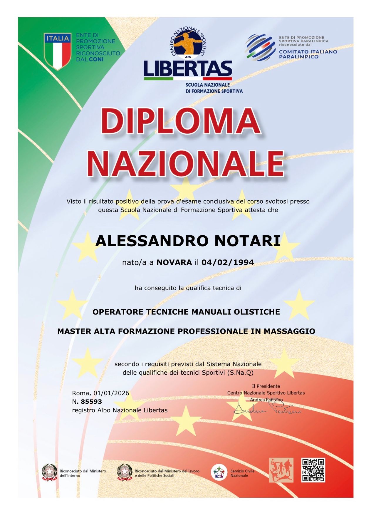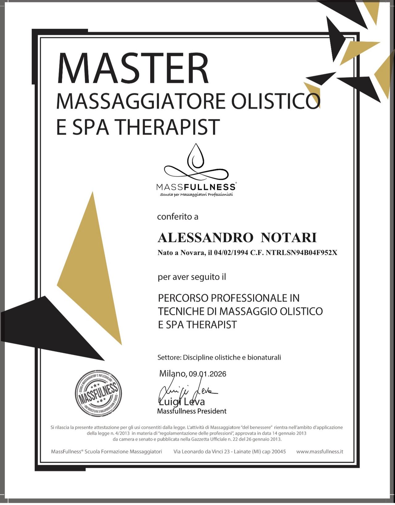 Ad inizio 2026 ho completato il mio percorso per diventare anche Massoterapia Olistico riconosciuto dal C.O.N.I. che mi ha permesso di incrementare le mie capacità ed unirle ai miei piani di trattamento.
