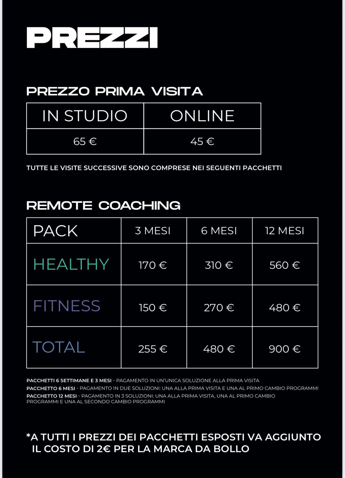 Qui sono presenti tutti i pacchetti con annessi costi. il costo Prima visita è un costo Una Tantum, tutte le visite e controlli successivi sono comprese nel prezzo di ogni pacchetto!