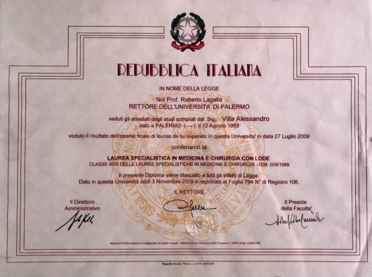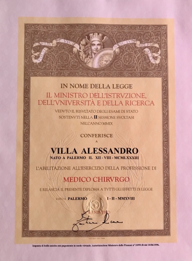 Si è laureato in Medicina e Chirurgia presso l’Università degli Studi di Palermo con voto di 110/110 e lode e dal 2010 è iscritto all’Ordine dei Medici Chirurghi ed Odontoiatri della Provincia di Palermo. Ha ottenuto il diploma di specializzazione in Neurochirurgia presso l’Università Federico II di Napoli con punteggio di 50/50 e lode.