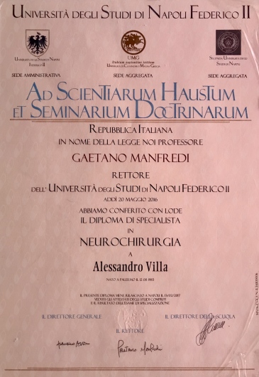Negli anni di specializzazione trascorsi presso la Divisione di Neurochirurgia dell’Università degli Studi di Napoli “Federico II” si è dedicato in particolare alla chirurgia endoscopica endonasale del basicranio e delle lesioni ipofisarie, in linea con la lunga tradizione della scuola napoletana. In quegli anni ha partecipato ad oltre 250 procedure chirurgiche eseguite con approccio endoscopico endonasale transsfenoidale.