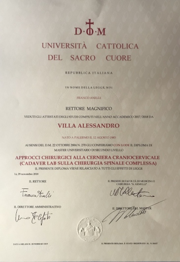 Nel 2018 ha conseguito il Master universitario di II livello “Approcci chirurgici alla cerniera craniocervicale (cadaver lab sulla chirurgia spinale complessa)” presso l’Università Cattolica del Sacro Cuore di Roma con voto di 30/30 e lode.