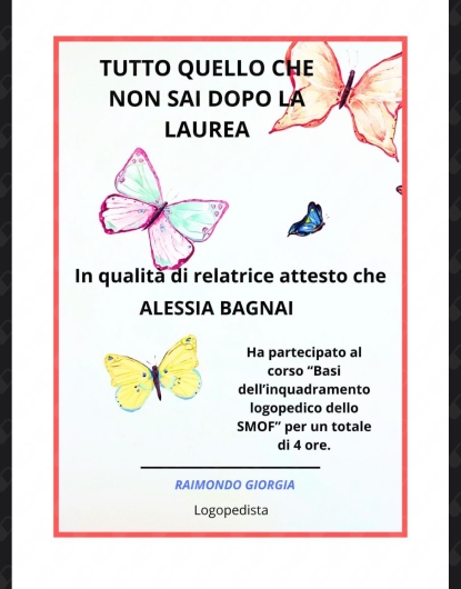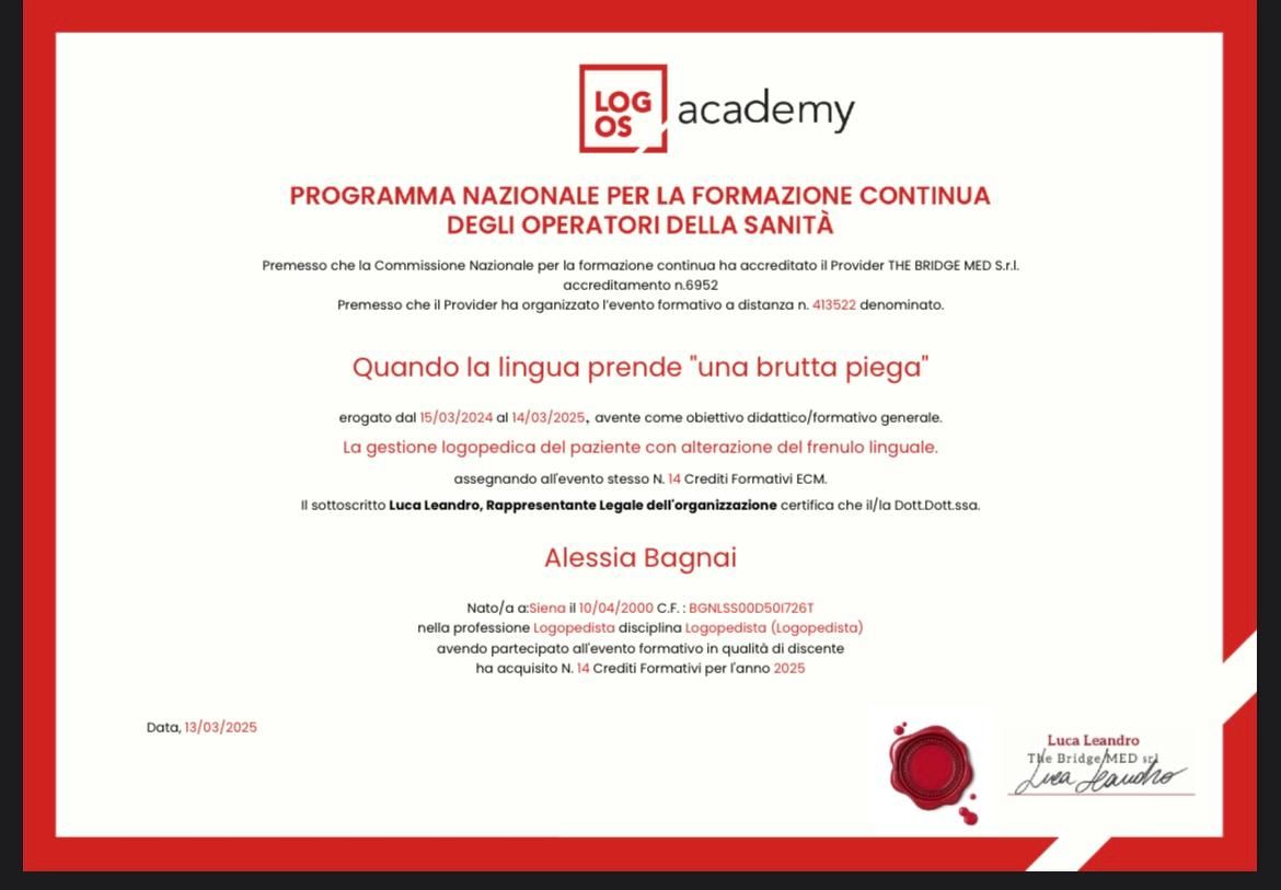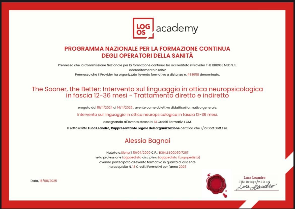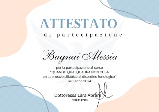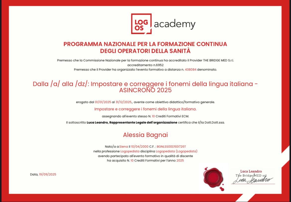 Corretta nel concludere il percorso quando il trattamento aveva ormai raggiunto il risultato da raggiungere. Disponibile a fare un check fra alcuni mesi per valutare un eventuale necessità di ulteriori sedute.• Centro Dia.Te.So. • terapia logopedica •