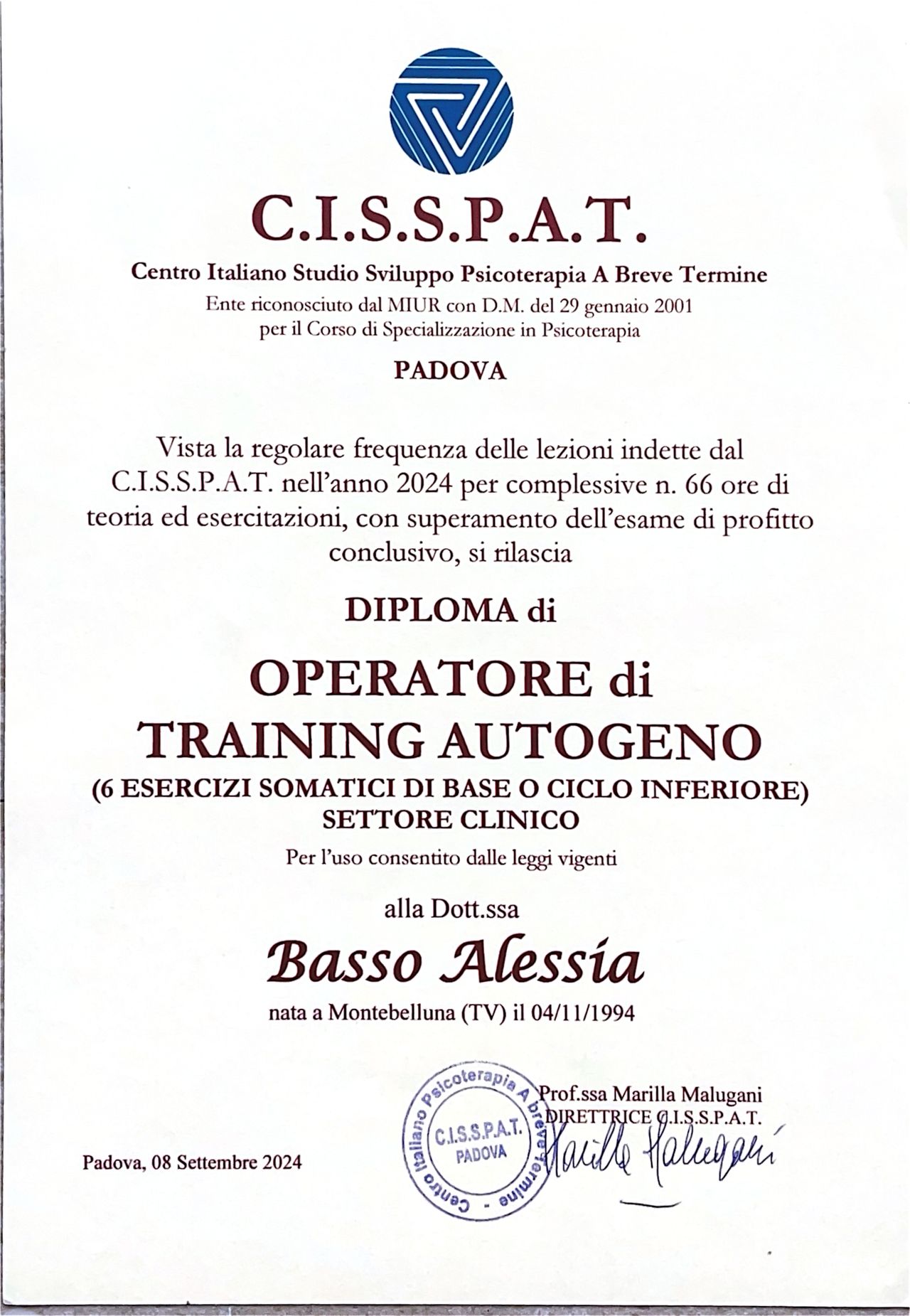 Sono la dott.ssa Alessia Basso (she/her), psicologa (Iscr. Albo Veneto 14336), sessuologa clinica e specializzanda in psicoterapia dinamica breve presso il CISSPAT di Padova. Oltre che da formazione teorica e continua, il mio percorso è caratterizzato da formazione pratica con stage, tirocini e collaborazioni con associazioni nell'ambito dell'attivismo LGBTQIA+. A livello professionale ho acquisito esperienza con coppie coinvolte nei percorsi di PMA e adozione, con adolescent* nell'orientamento scolastico, con persone nel percorso di affermazione di genere. Ricevo online e a Padova.
