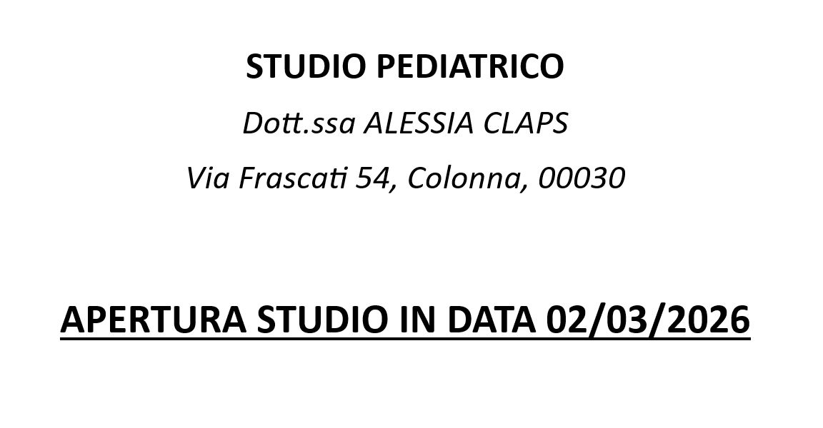 Avviso tutti i pazienti e le famiglie che in data 02/03/2026 prenderò servizio presso lo studio pediatrico situato in via Frascati, 54, Colonna 00030 (RM).