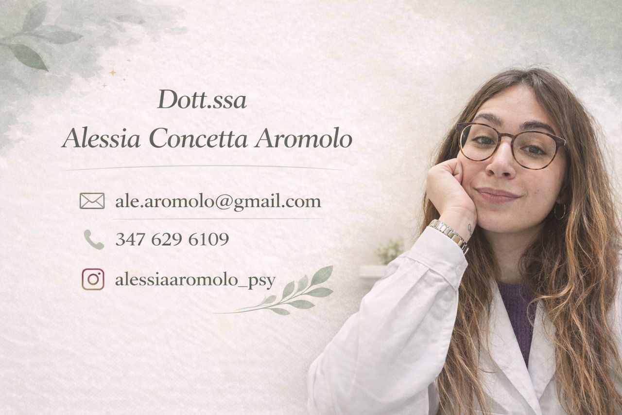 Sono Alessia Concetta Aromolo, psicologa ad orientamento clinico e specializzanda in psicoterapia cognitivo-comportamentale.