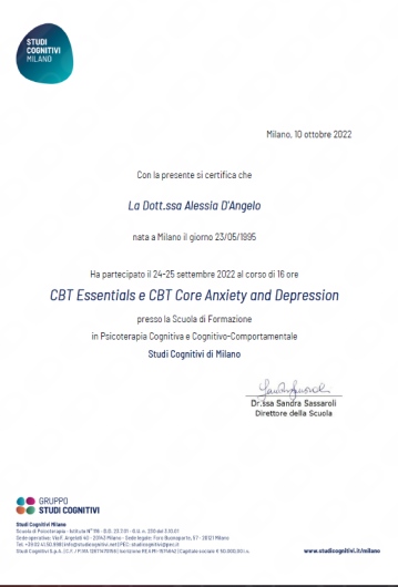 Sono la Dott.ssa Alessia D’Angelo, psicologa clinica, consulente di coppia e psicoterapeuta cognitiva-comportamentale CBT. Accolgo le richieste di coloro che si trovano in un momento di fatica e sofferenza personale, di coppia e di genitori di figli adolescenti in difficoltà (sia per la coppia genitoriale che per il figlio/a adolescente) che sentono il bisogno di parlare con un professionista capace di accogliere il loro dolore/malessere/fatica. Psicologo e paziente lavorano insieme intraprendendo un percorso verso la ricerca di un nuovo equilibrio, cucito su misura rispetto a quelle che sono le esigenze specifiche della persona. Ognuno di noi ha bisogni e tempi diversi. Perciò, ogni percorso è unico ed irripetibile. Intervengo su diverse aree: ansia, attacchi di panico, fobie, depressione, difficoltà nella regolazione emozionale, disagio nelle relazioni sociali, problemi di autostima, superamento del lutto, accettazione della separazione da una persona cara, difficoltà nell’accettazione di parti di sé, problemi di comunicazione, gestione delle emozioni, gestione del conflitto. Mi occupo inoltre di problematiche di coppia sia dal punto di vista relazionale che genitoriale, lavorando sulla comunicazione, sulla gestione delle “fatiche” di coppia e della relazione con i propri figli. Credo fortemente nell’importanza di imparare ad ascoltarsi, ciò che sentiamo, viviamo e proviamo ha un fortissimo impatto sulla nostra vita, nessuna e emozione o pensiero doloroso andrebbe ignorato. Per tale ragione non esiste una sofferenza o una fatica più valida di un’altra, ogni malessere o ragione di sofferenza è legittima. Nello studio dello psicologo si trova una spazio per dare voce a tutto ciò che sentiamo, proviamo e pensiamo, impariamo a mettere in ordine i pensieri, prendiamo conoscenza del nostro modo di funzione, apprendiamo nuove strategie e accresciamo le nostre risorse. La terapia è un percorso.