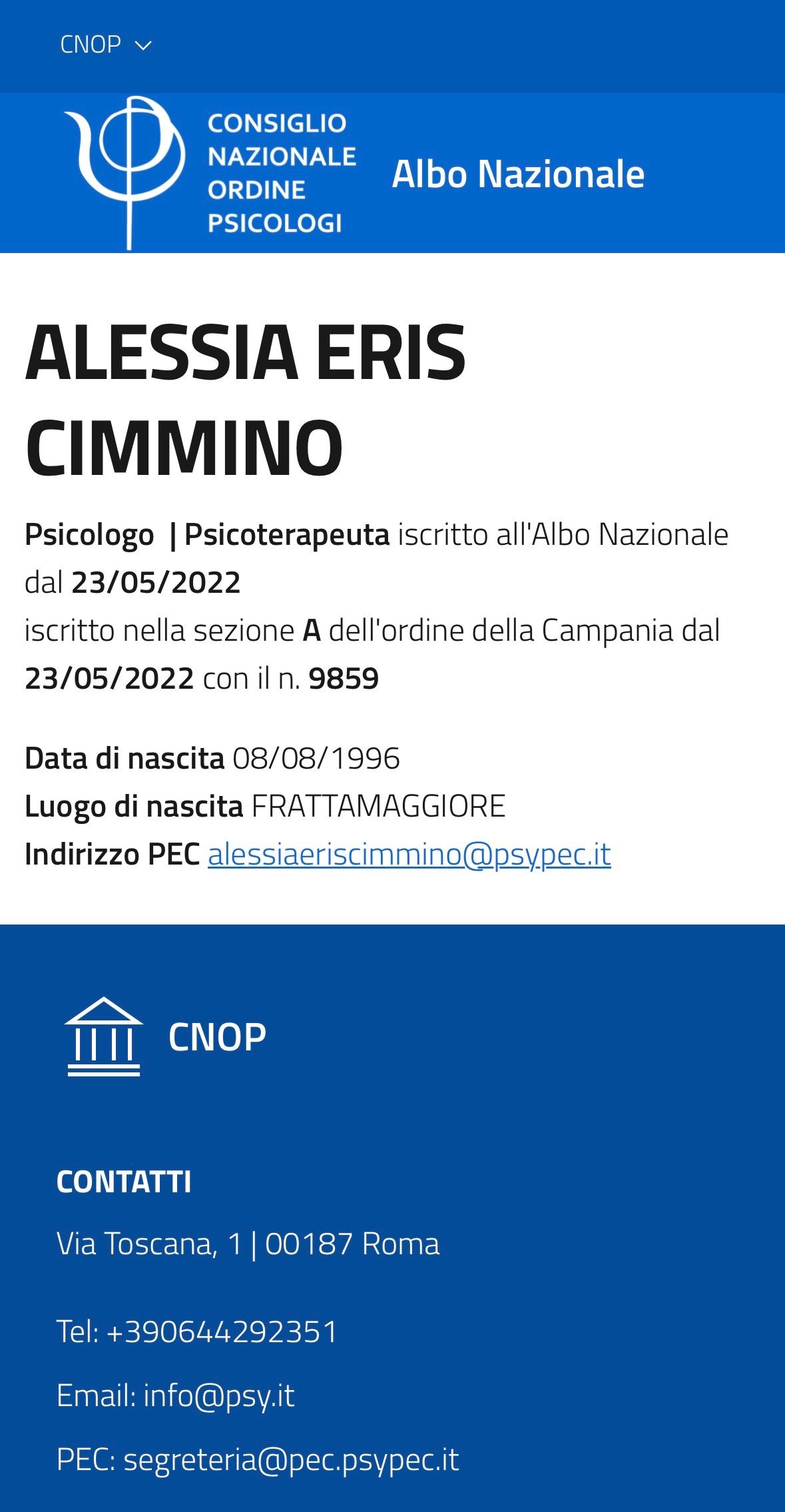 Sono la Dottoressa Alessia Eris Cimmino, Psicologa Clinica e Psicoterapeuta a orientamento Psicodinamico Integrato; Psicodiagnosta Clinico e Forense Terapeuta EMDR certificata (EMDR Europe Association).