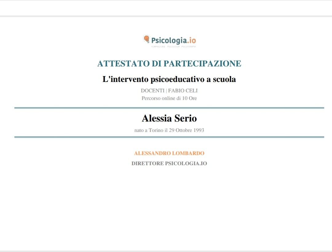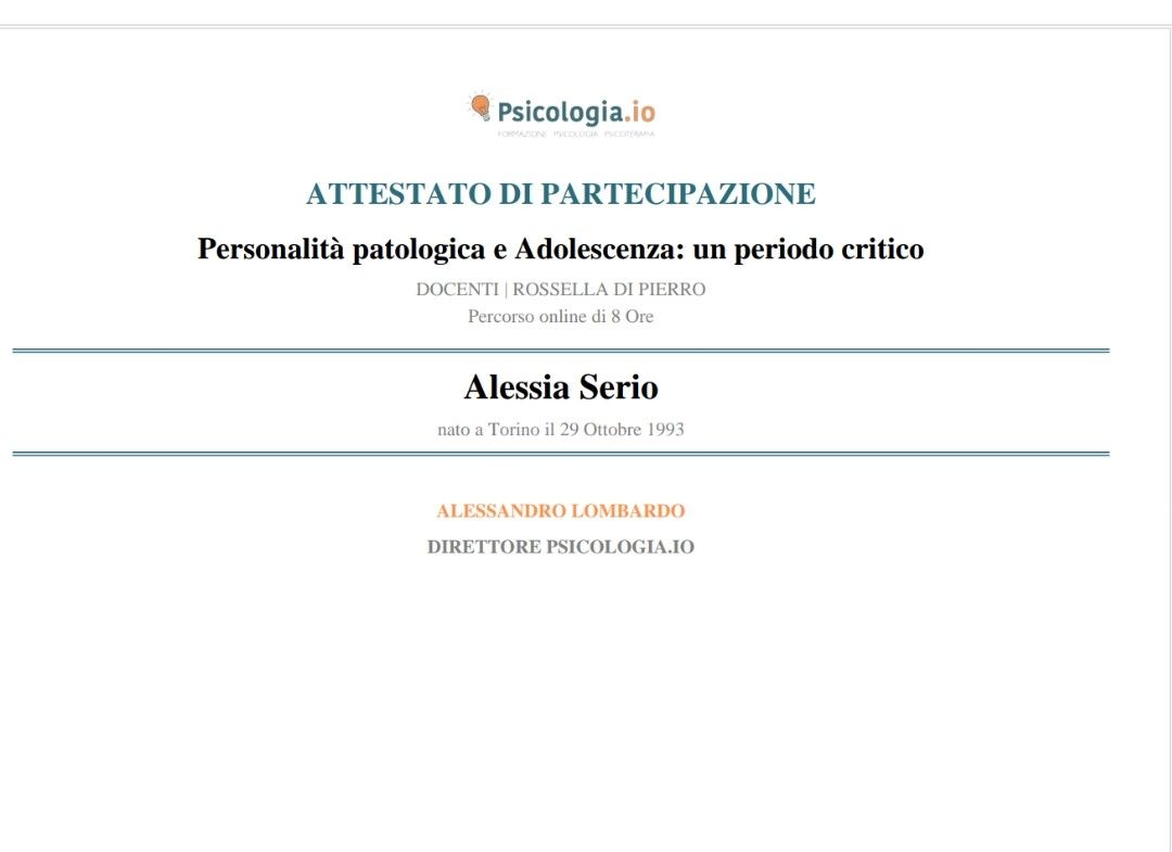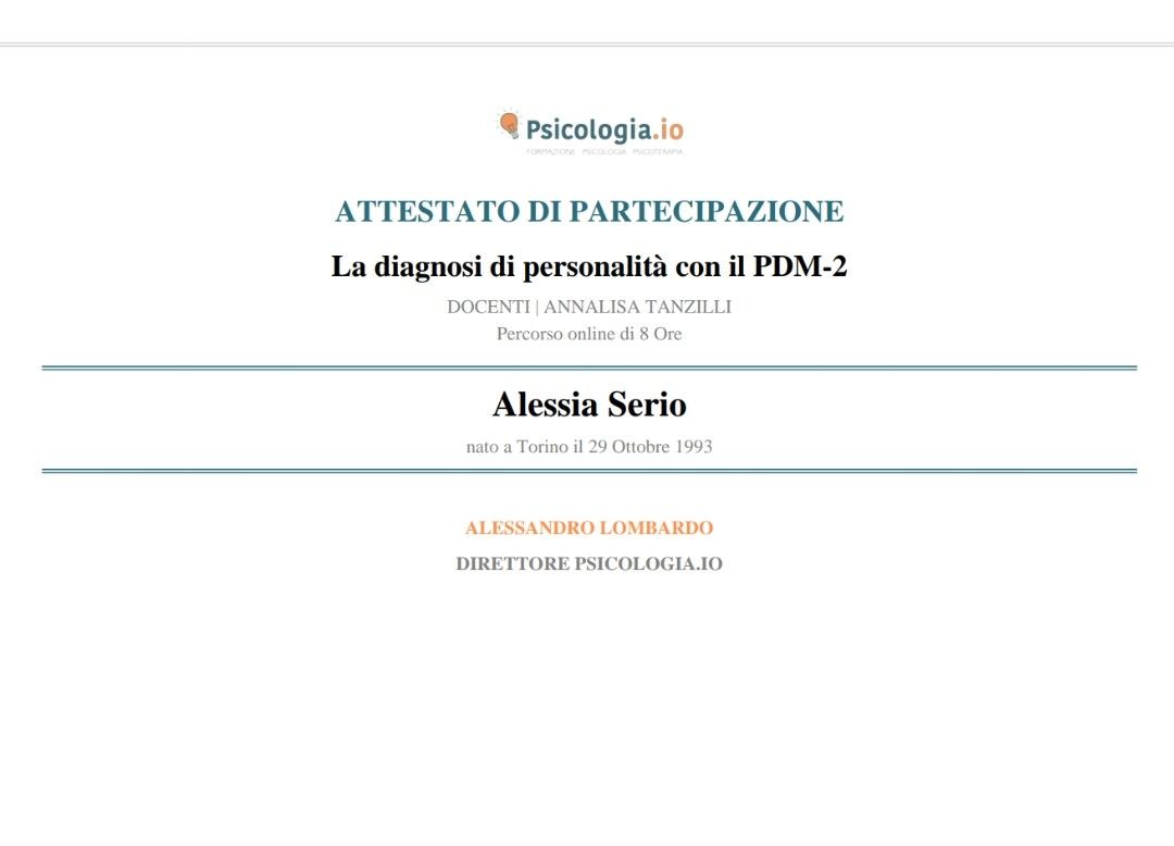 Mi chiamo Alessia Serio, sono una psicologa abilitata presso l’Ordine degli Psicologi del Piemonte (iscr. n° 10693) e psicoterapeuta in formazione ad indirizzo relazionale-sistemico.