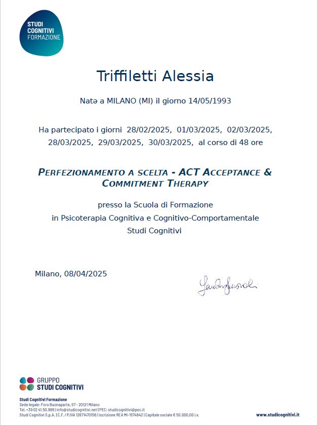 Attualmente sono al terzo anno della Scuola di Specializzazione in Psicoterapia Cognitivo-Comportamentale (Studi Cognitivi), dove continuo a formarmi nella gestione clinica di disturbi emotivi, comportamentali e relazionali.