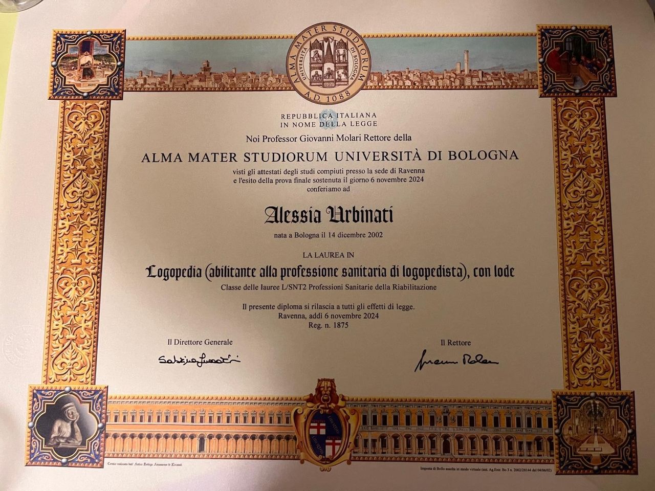 Ho conosciuto Alessia durante il nostro percorso universitario in Logopedia e ho avuto modo di apprezzarne fin da subito la serietà, la curiosità e la grande empatia. È una professionista attenta, precisa e sempre aggiornata, con una particolare sensibilità nel creare un rapporto di fiducia con i pazienti, soprattutto i più piccoli. È una logopedista competente, capace di ascoltare e costruire percorsi personalizzati ed efficaci.