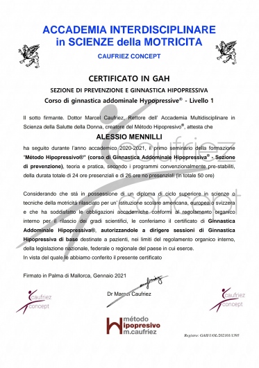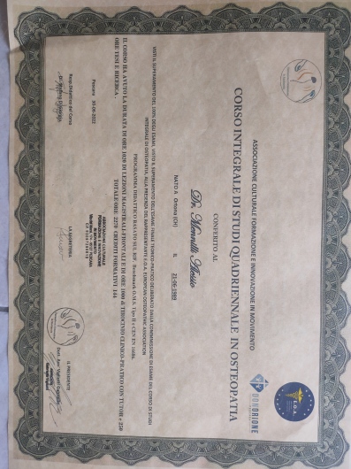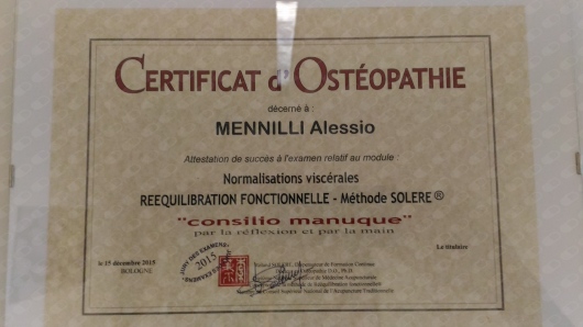 Osteopata D.O (2019), Riequilibratore funzionale metodo Solère (2013) Viscerale, articolare, energetico, Tuina Viscerale, T.E.M.A. Livello Expert e Tutor metodo Solère.
