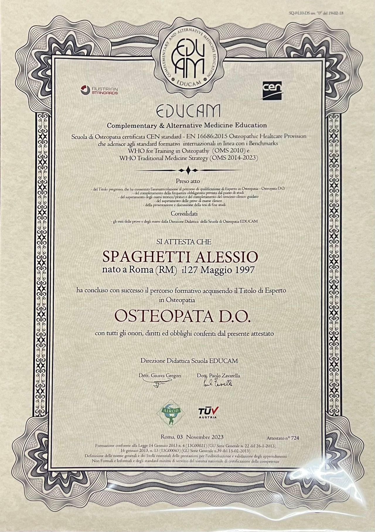 Mi chiamo Alessio Spaghetti e sono un osteopata formato presso Educam, dove ho costruito una solida preparazione teorica e pratica. Lavoro con un approccio centrato sulla persona, offrendo trattamenti mirati a migliorare lo stile di vita, ottimizzare la postura e accompagnare il paziente attraverso esercizi specifici. Quando necessario, collaboro con professionisti sanitari di diverse discipline, per garantire un percorso completo e integrato. Oltre all’attività clinica, sono assistente docente presso Educam, ruolo che mi permette di contribuire alla formazione dei futuri osteopati e di continuare a crescere professionalmente.