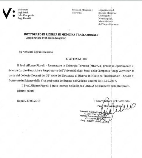 Opera presso la UOC di Chirurgia Toracica, della Università della Campania Luigi Vanvitelli di Napoli, Edificio 17 via Pansini, Napoli
