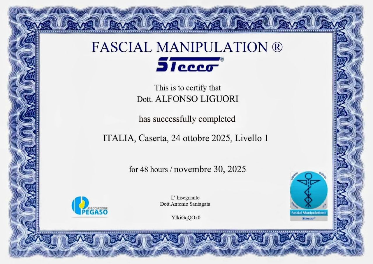 -MANIPOLAZIONE FASCIALE (STECCO METHOD) e NEUROMUSCOLOSCHELETRICA ,con o senza ausilio di IASTM (strumenti assistiti per la mobilizzazione dei tessuti molli). - CERTIFICATO IN TERAPIA MANUALE VERTEBRALE E PERIFERICA.