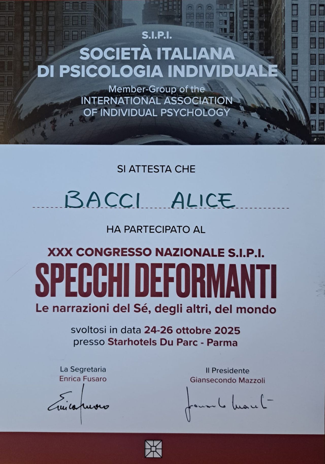 Mi chiamo Alice Bacci, sono una psicologa formata presso l'Università degli studi di Torino, e specializzanda in psicoterapia adleriana.