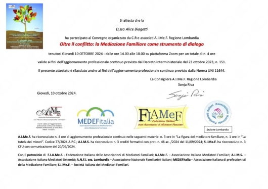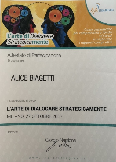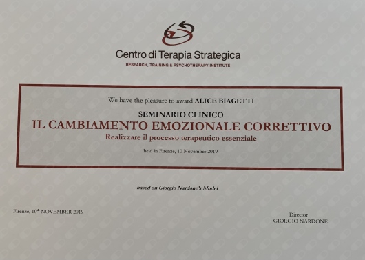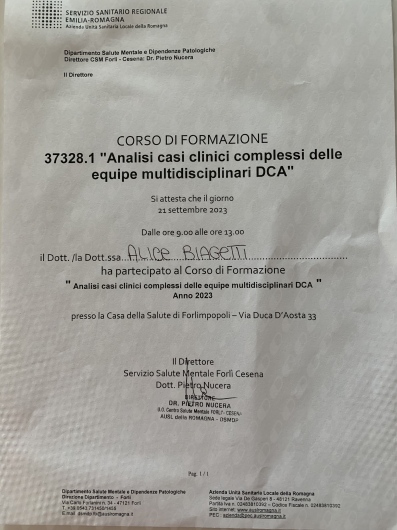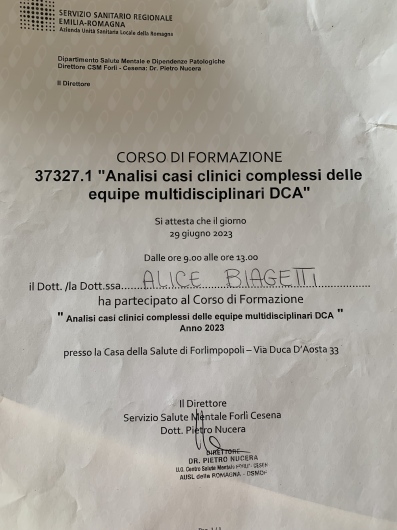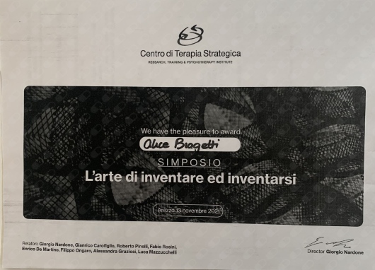 Ringrazio tanto Alice per il percorso che abbiamo fatto. Porto con me tanti suoi insegnamenti. La consiglio vivamente. Sempre puntuale e con flessibilità di orari. Lo studio ha un ampio parcheggio ed è molto accogliente. Grazie!