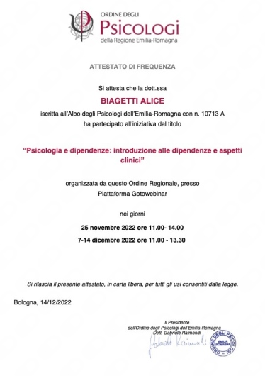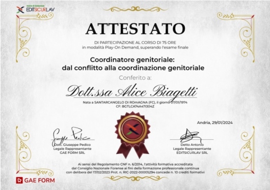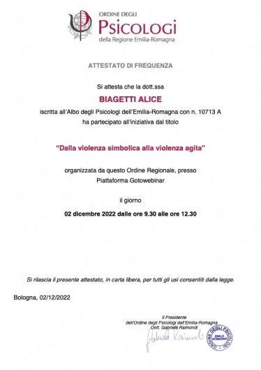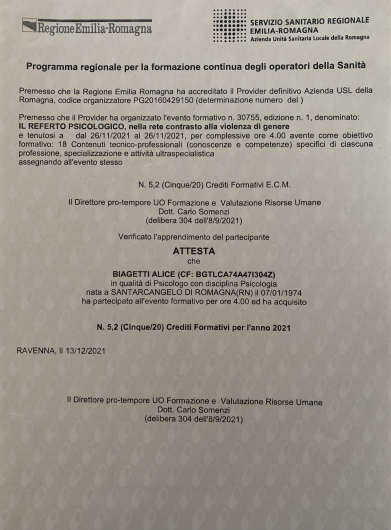 Buongiorno, sono la Dott.ssa Alice Biagetti, Psicologa-Psicoterapeuta Sistemica Relazionale in formazione, Mediatrice familiare e Coordinatrice Genitoriale. Seguo individui adulti e adolescenti, coppie, genitori, famiglie e famiglie ricomposte. Mi occupo di gestione emotiva, ansia, stress, depressione, disturbi alimentari; problematiche di coppia, conflitti e separazioni, coordinazione genitoriale e sostegno alla genitorialità; problematiche relazionali con sè stessi e con gli altri, comunicazione efficace, gestione del cambiamento, elaborazione del lutto; orientamento scolastico e professionale, problematiche aziendali e lavorative. La mia passione nasce dagli studi filosofici in cui anima, corpo e mente sono i protagonisti indiscussi. Come Psicologa posso concretamente aiutare il prossimo nell'affrontare i disagi e le difficoltà che ognuno incontra nella vita attraverso un percorso di consapevolezza e riscoperta delle proprie risorse e potenzialità al fine di costruire una vita significativa e appagante, auspicando alla migliore versione di sè stessi. Offro colloqui di sostegno e supporto psicologico; abilitazione e riabilitazione; consulenza, psicoeducazione e valutazioni psicodiagnostiche. Svolgo la mia attività su appuntamento a Ravenna presso il Centro di Psicoterapia AB MIND e online. email: alice@biagetti.net Cell 3355425139