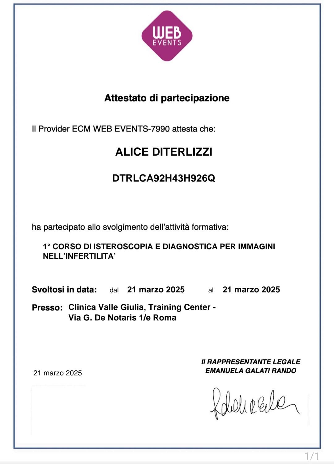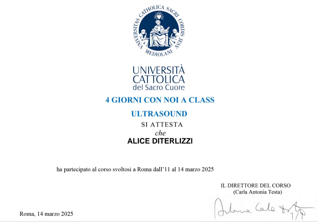 Certificazione internazionale di diagnosi prenatale, il Diplôme Interuniversitaire in ecografia ostetrica e ginecologica conseguito presso l'Università di Parigi - Ospedale Necker, nel 2022.