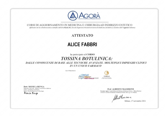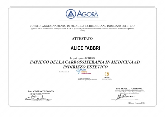 Mi presento: sono la Dott.ssa Alice Fabbri, laureata in medicina e chirurgia, regolarmente iscritta all’ordine dei medici da Ancona, possiedo la certificazione BLSD e PBLSD, l’attestazione di medico Ozonoterapista in campo dermatologico, estetico, ortopedico, neurologico, gastroenterologico, urologico e ginecologico.