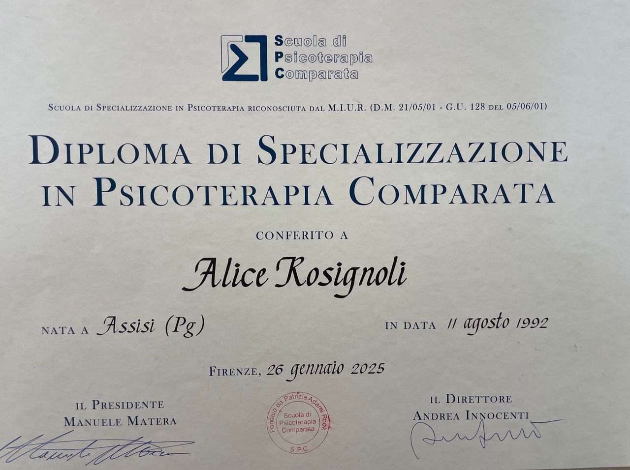Sono la Dottoressa Rosignoli Alice, psicologa - psicoterapeuta ad orientamento comparato.